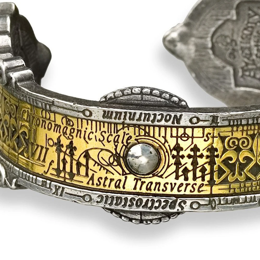 • Des mystérieux mécanismes d’horlogerie, des fleurs de Lys et d’énigmatiques griffonnages sont gravés sur toute la longueur de ce magnifique bracelet de style Steampunk.