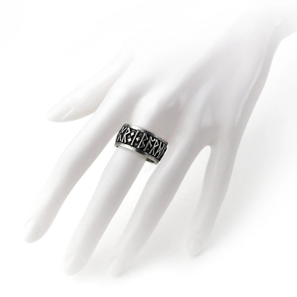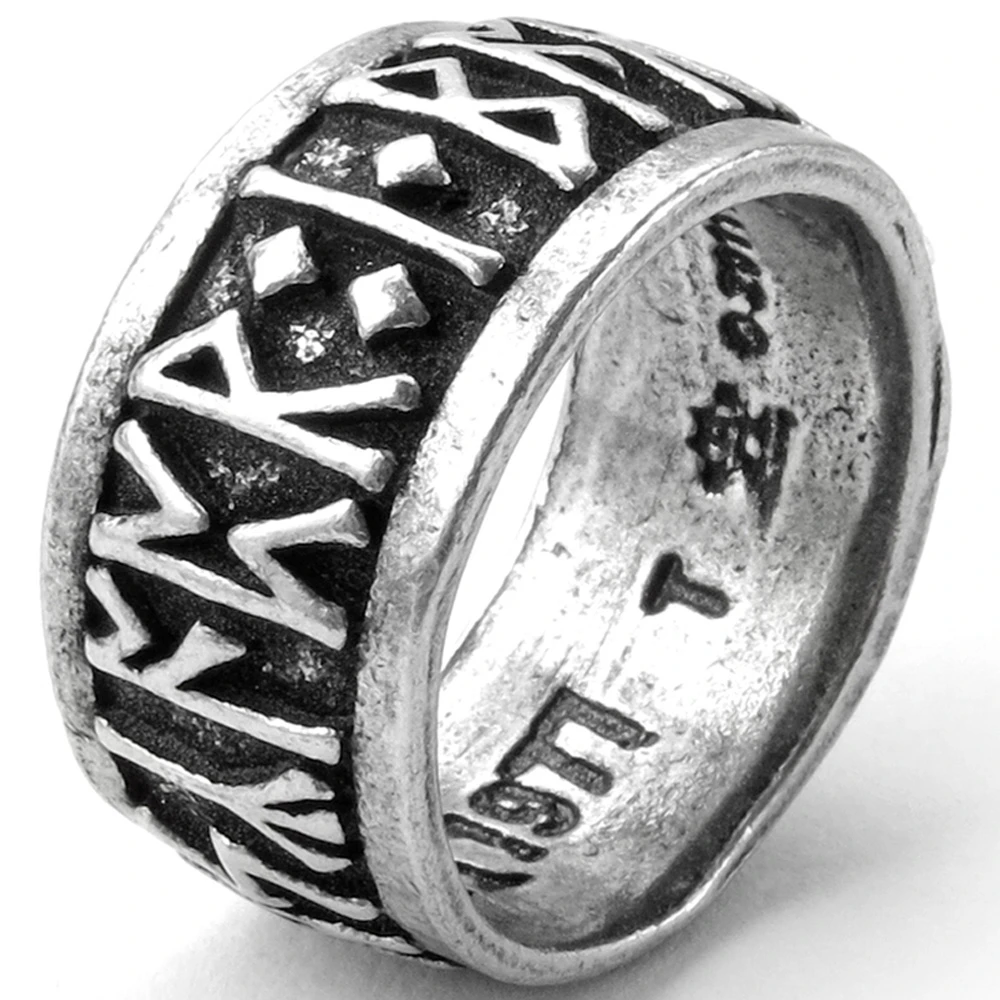 • Un anneau runique convexe en étain avec des lettres runiques découpées en profondeur.