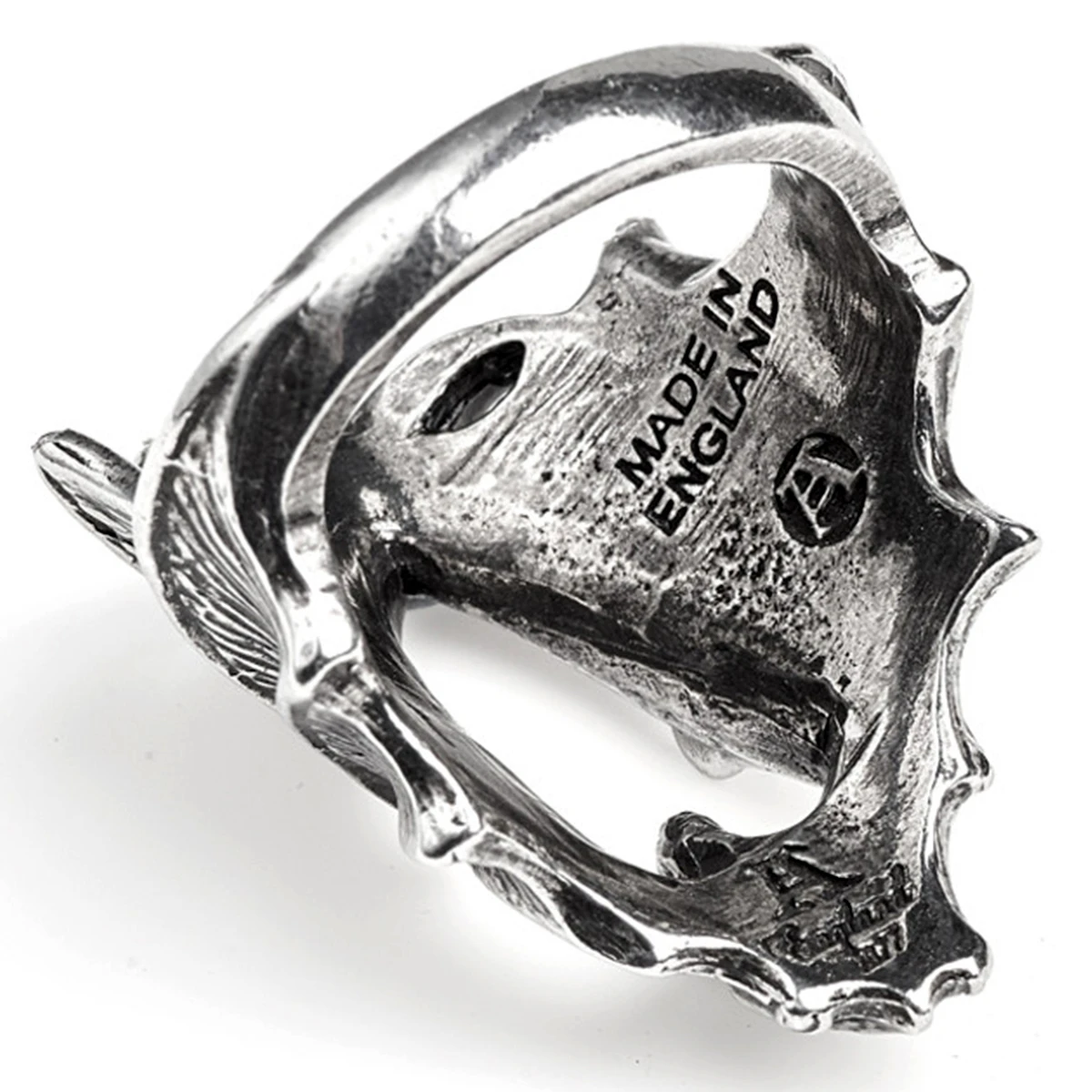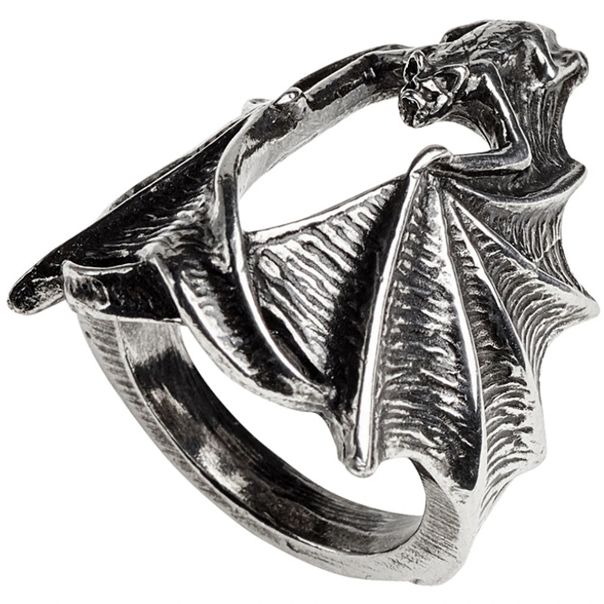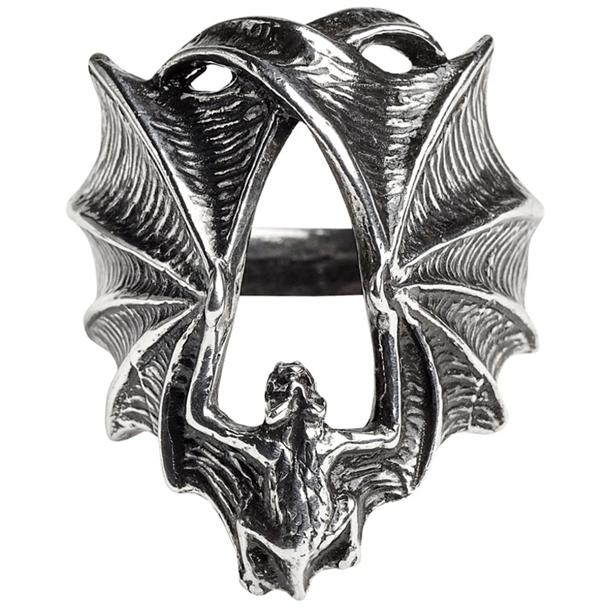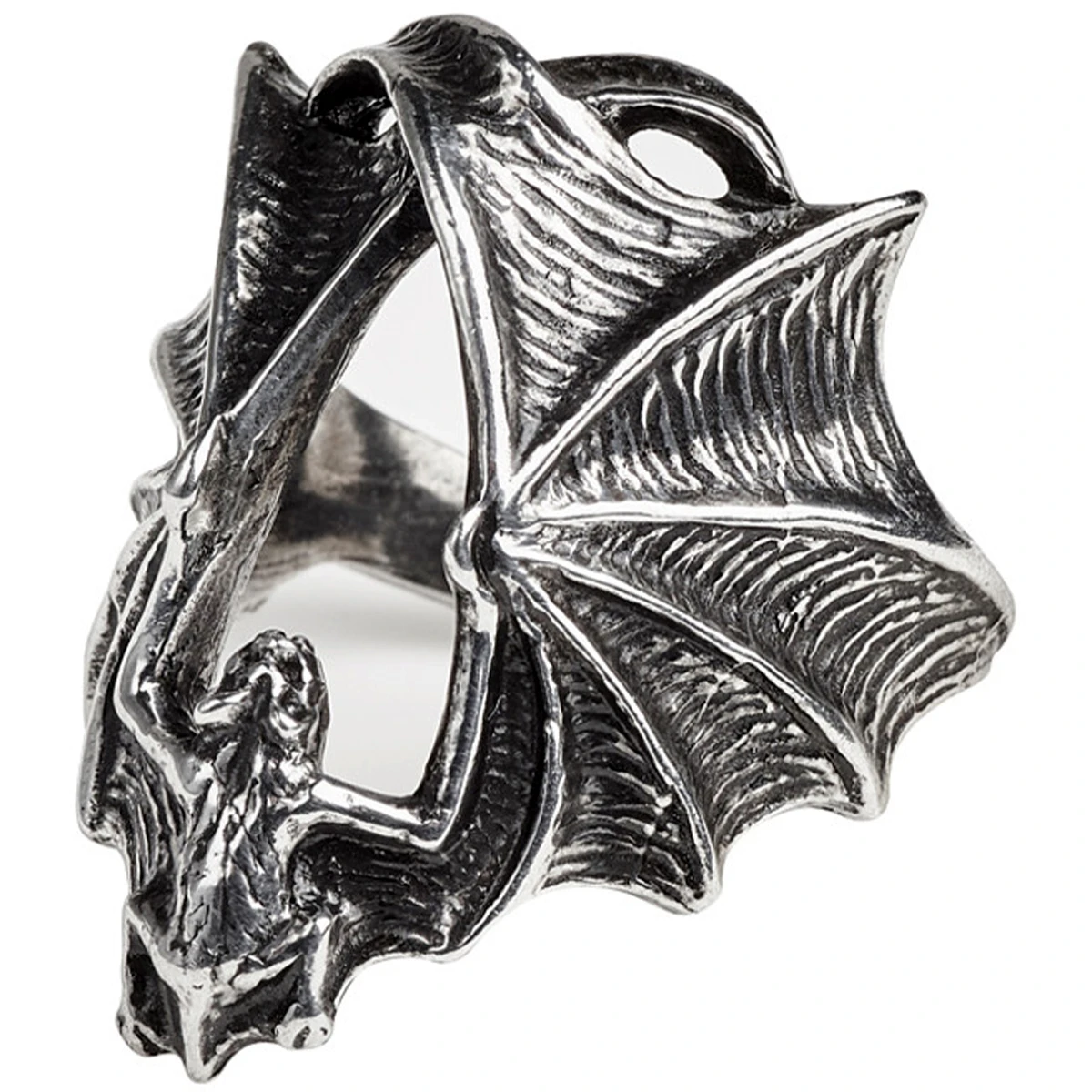 • Une grande bague en étain vieilli en forme de chauve-souris rampante, avec d’énormes ailes déployées couvrant le doigt.