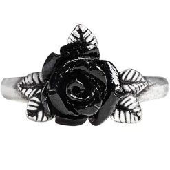 • Un délicat anneau en étain serti de feuilles de roses et d’un petit capitule en résine noire.