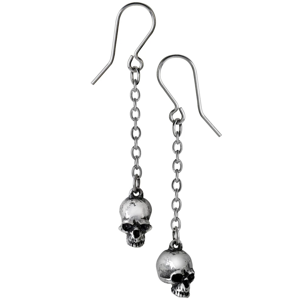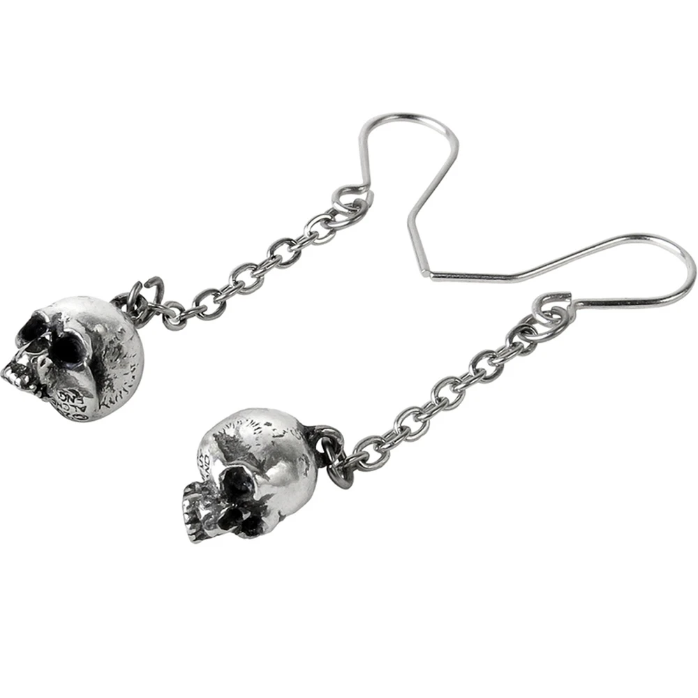• Une paire de petites têtes de mort sans mâchoires en étain, suspendues par le haut à une chaîne fine et à des boucles d’oreilles en acier inoxydable.