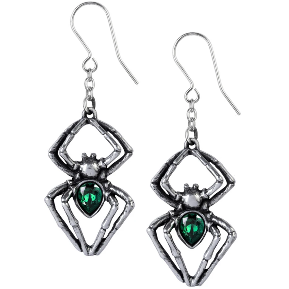 • Une paire de boucles d’oreilles araignées en étain antique de 40 mm de long, leurs corps sont sertis de cristaux Swarovski verts; sur des fils d’oreille en acier chirurgical.