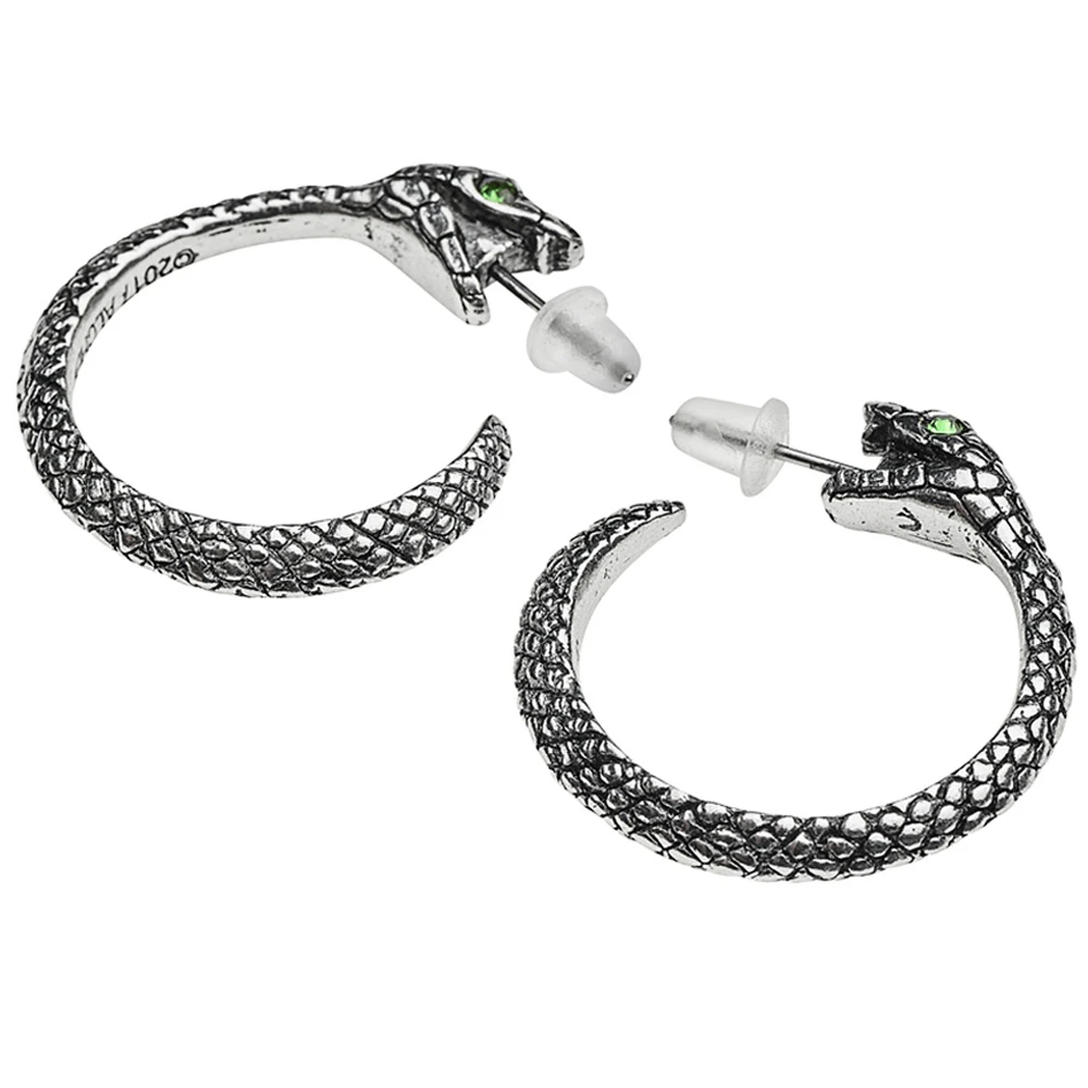 • Une paire de boucles d’oreilles détaillées en étain de 25 mm de diamètre représentant un serpent avec des yeux en cristal Swarovski verts, semblant avaler leur propre queue lorsqu’elles sont portées.