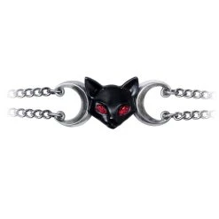 • Un bracelet chaîne en étain au motif triple lune mais avec la pleine lune remplacée par une tête de chat noir aux yeux rouges en cristal d’Autriche, flanqué de part et d’autre d’un croissant de lune en étain brillant.