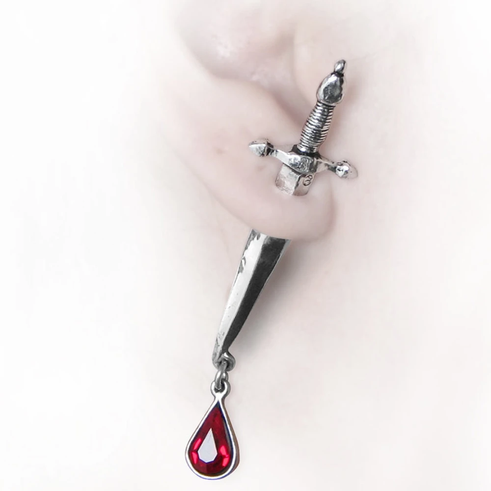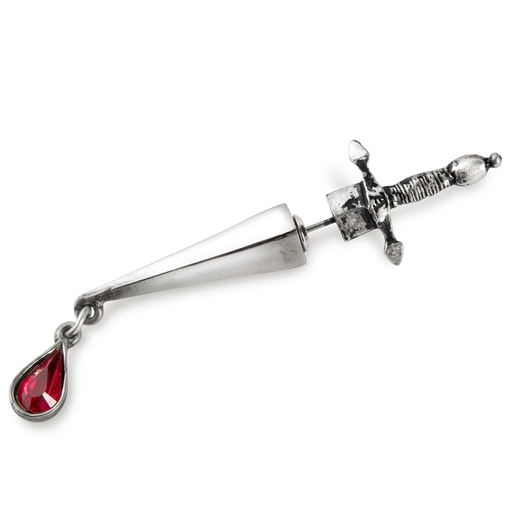 Boucle d’oreille en étain et acier de haute qualité représente une épée, au bout de laquelle une goutte de sang coule encore… L’épée de Cesare Borgia, sans doute…