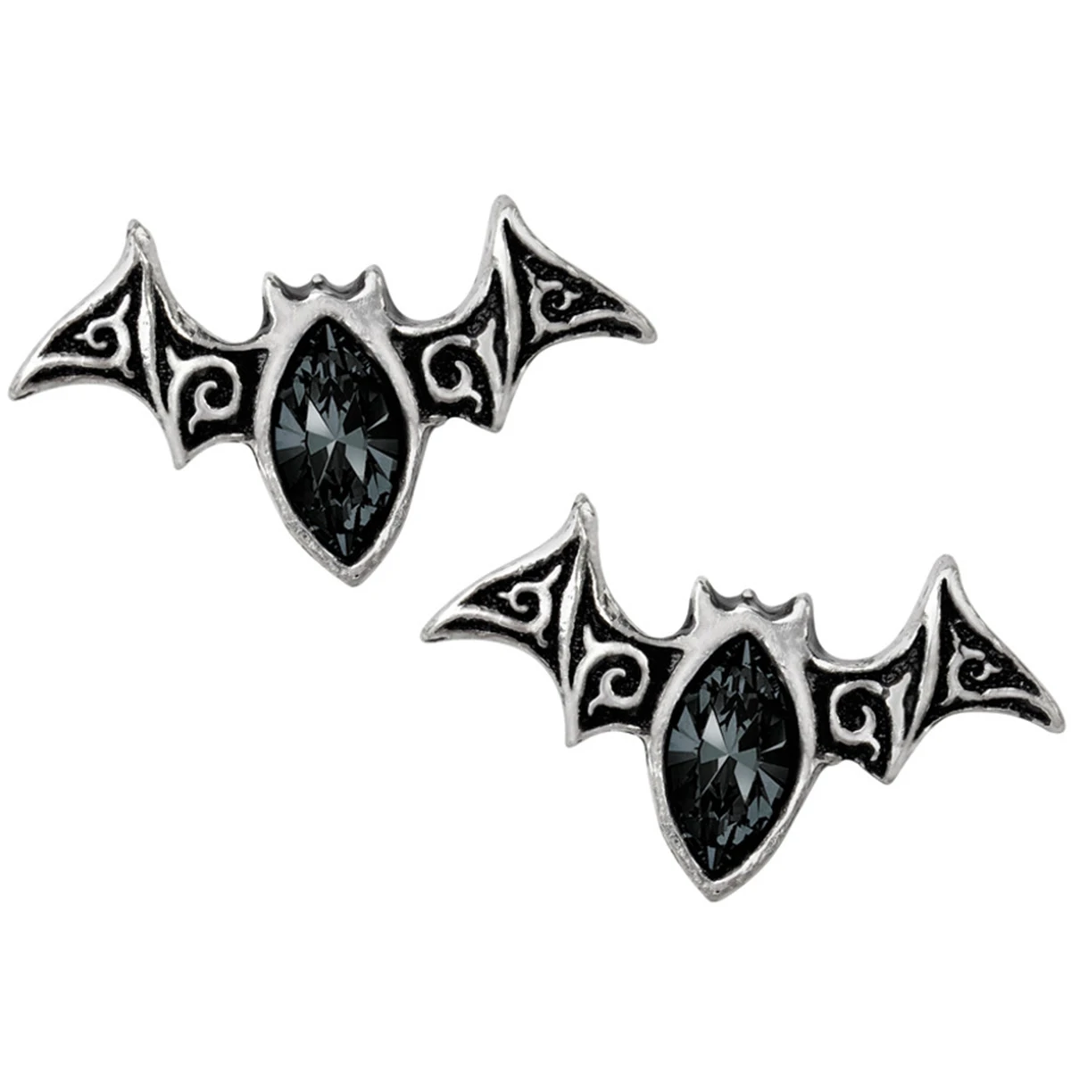 • Une paire de clous d’oreilles en étain en forme de petites chauves-souris stylisées avec des cristaux de diamant noir en forme de vésicule ; avec tiges d’oreille en acier chirurgical.