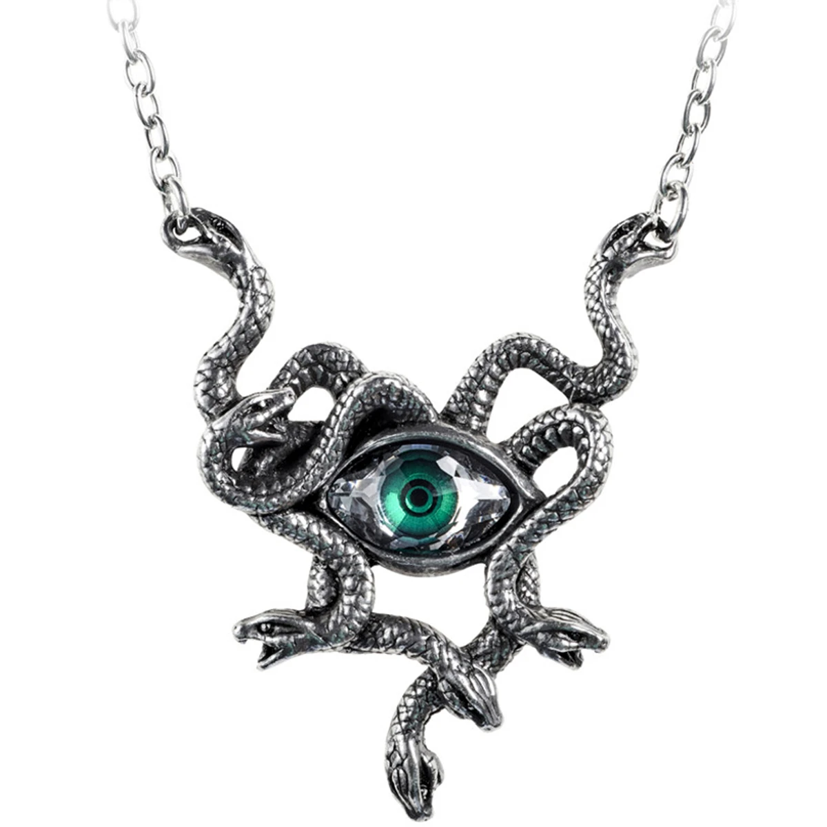 • Le collier en étain d’un enchevêtrement de serpents se tordant autour d’un œil en cristal autrichien facetté avec iris vert émeraude.