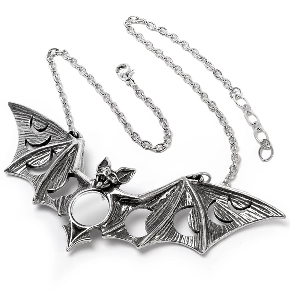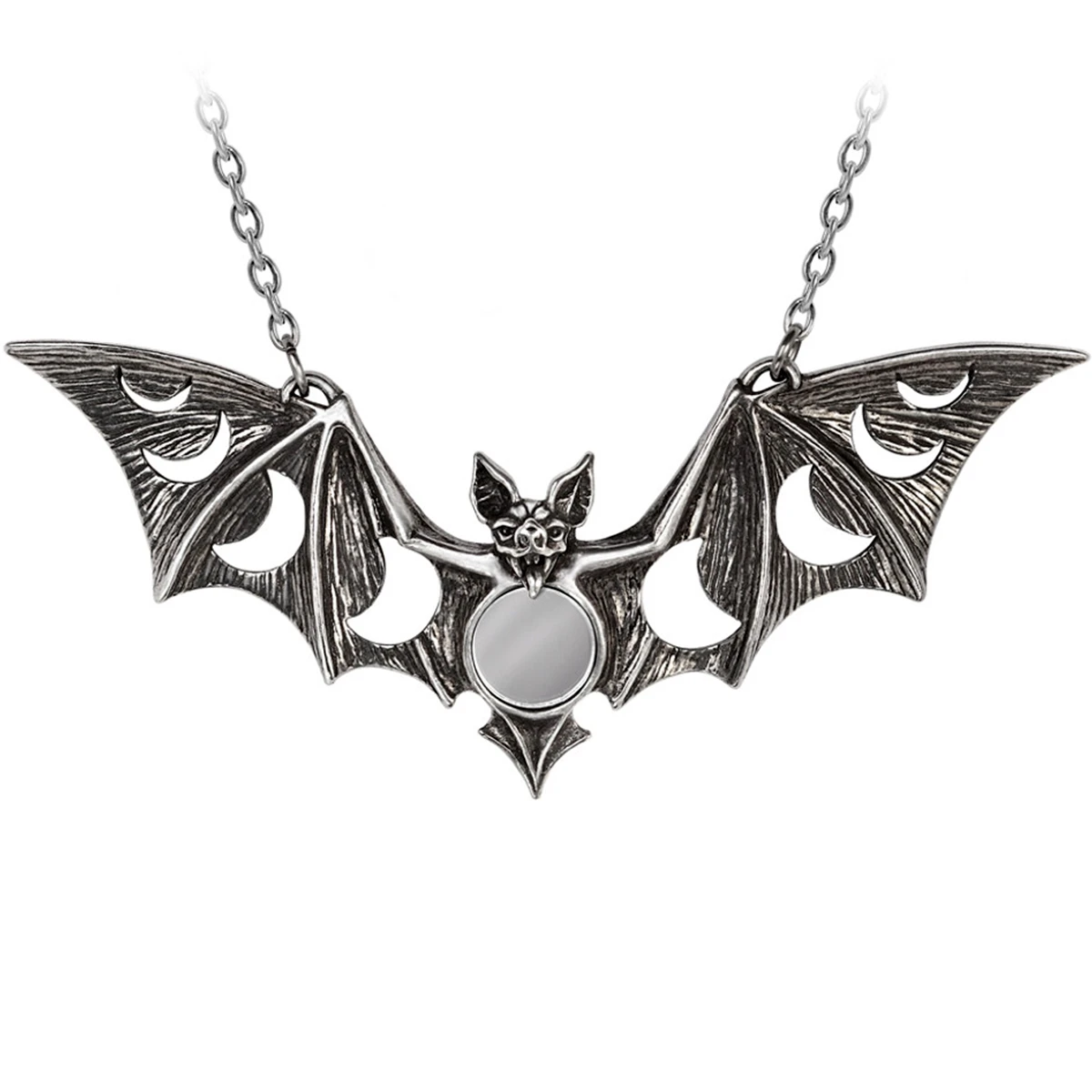 • Un collier en forme de chauve-souris avec une phase de lune découpée et une pièce centrale en miroir incrusté.