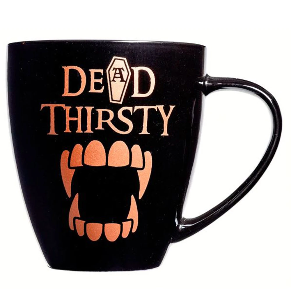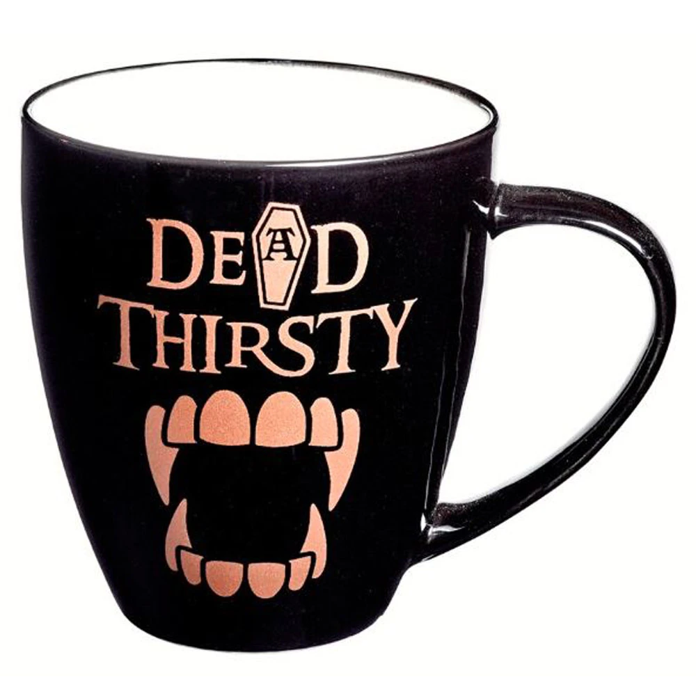 Une belle tasse noire avec impressions en or rosé ornée du slogan «Dead Thirsty» (Mort Assoiffé) avec des illustrations de cercueil et dents de vampire!
