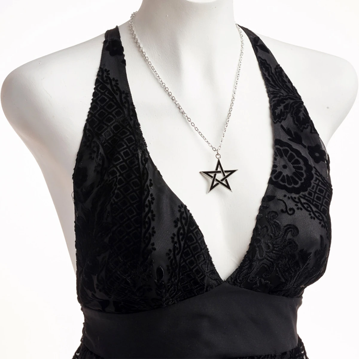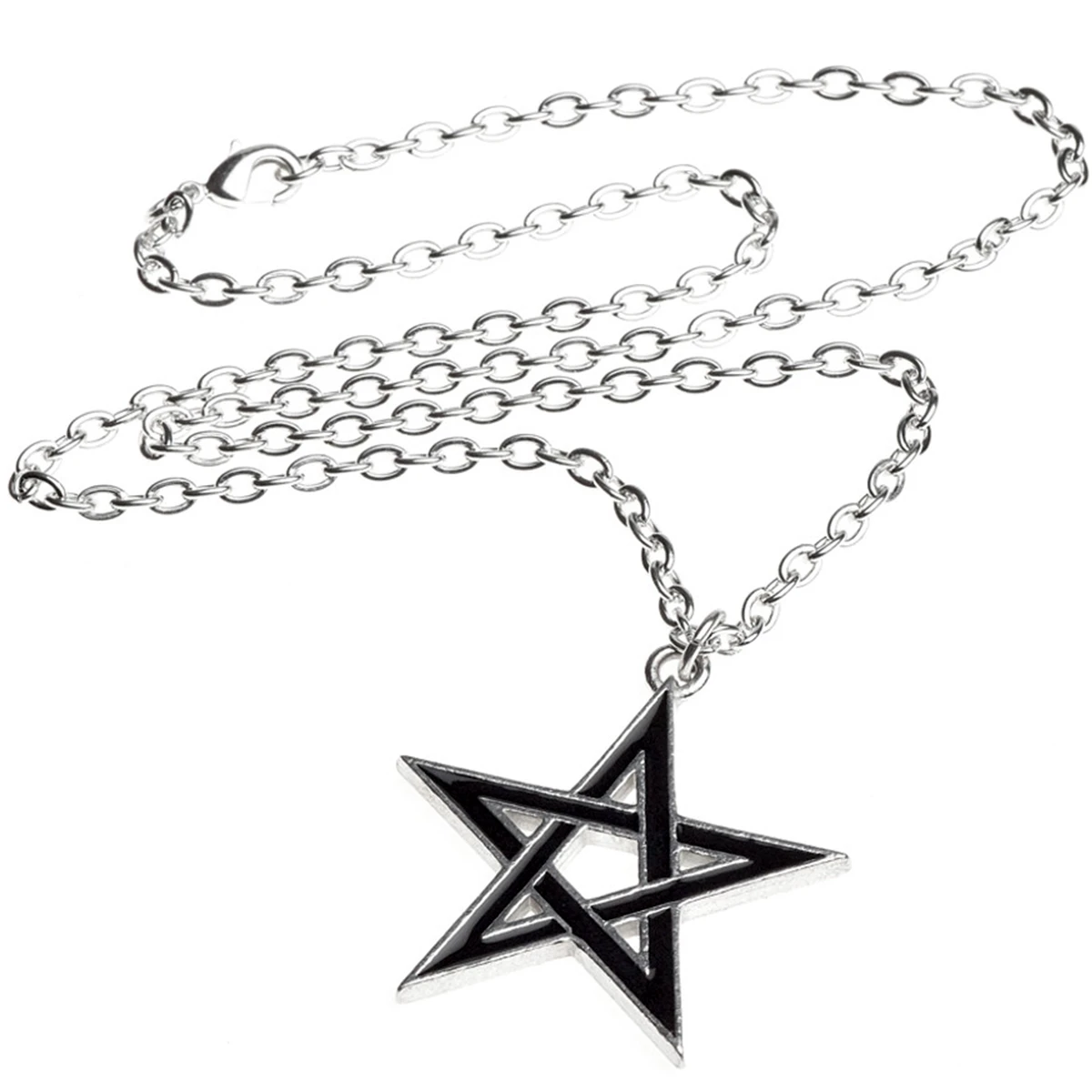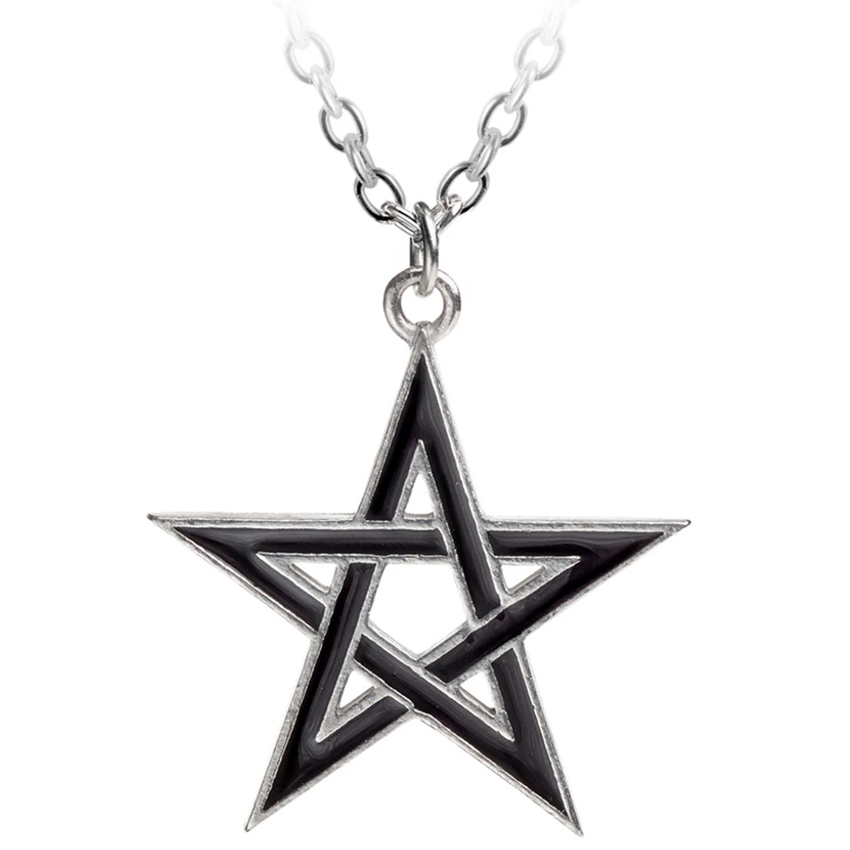 • Un pendentif pentagramme de taille moyenne en étain émaillé noir.