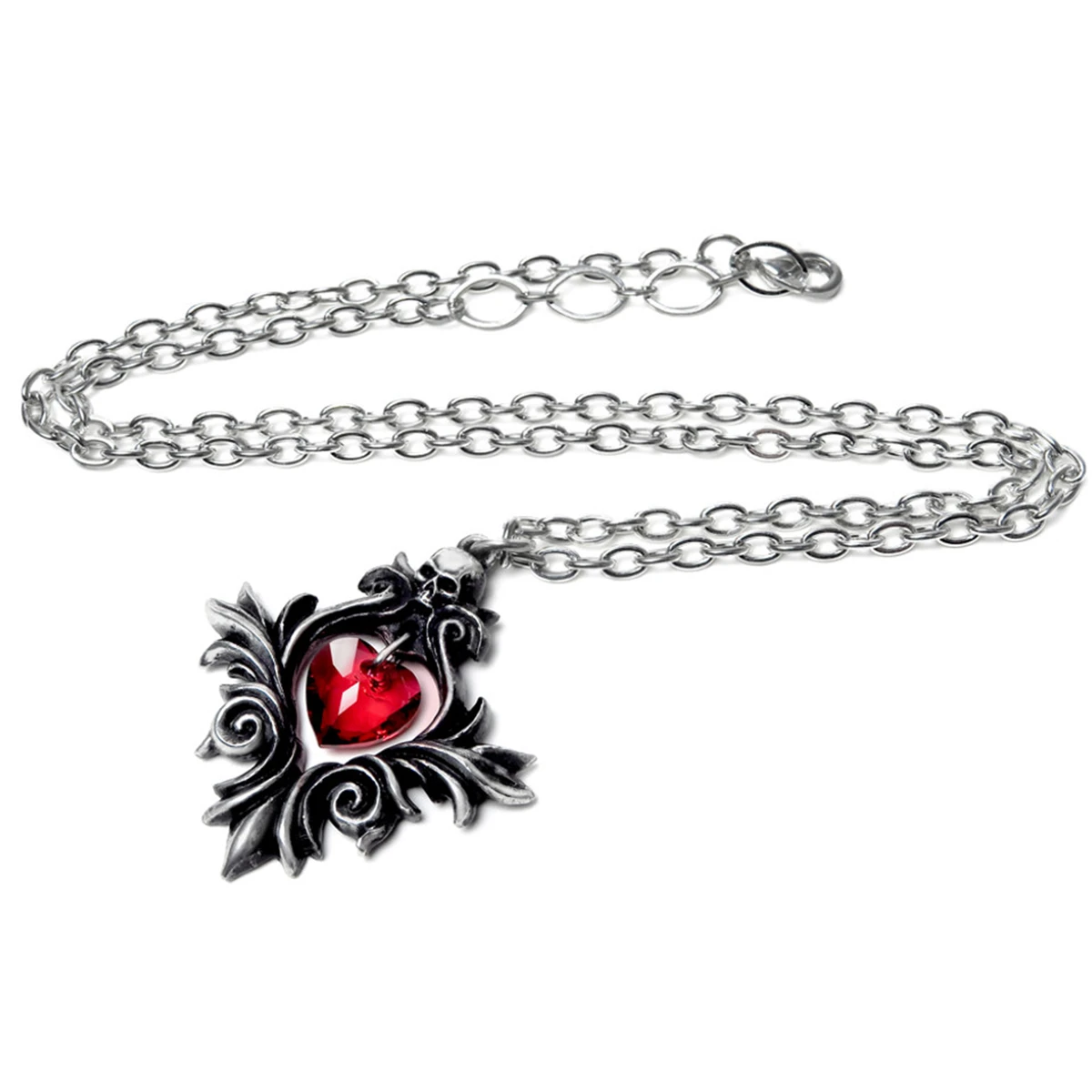 • Un pendentif en étain antique de 40 mm de long avec un cadre baroque en volutes surmonté d’un petit crâne et avec un cœur en cristal autrichien rouge suspendu en son centre.
