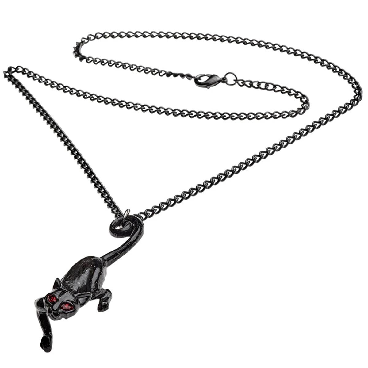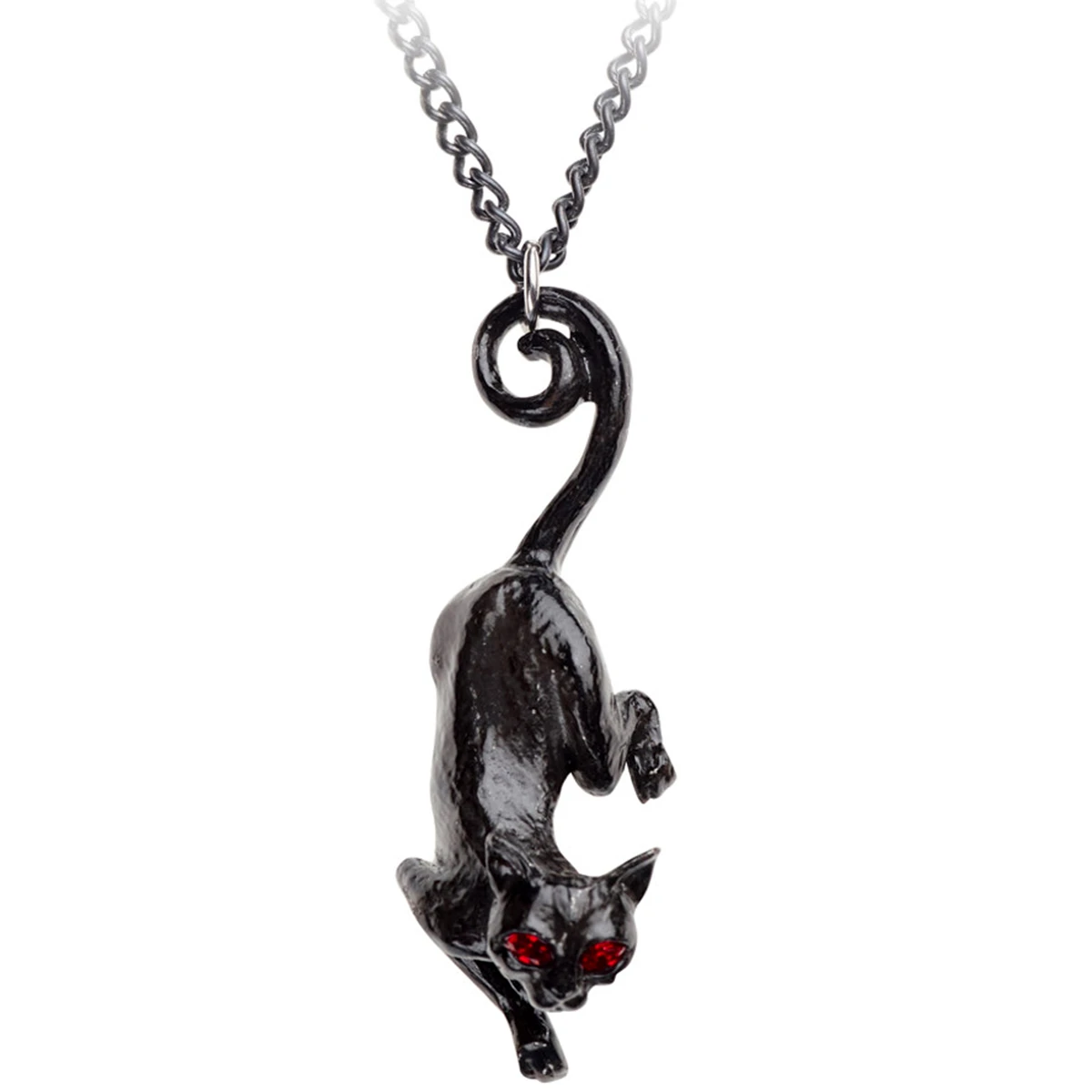 • Un pendentif en étain noir coulé d’un chat harceleur suspendu à la chaîne par la queue, avec des yeux rouges en cristal d’Autriche.