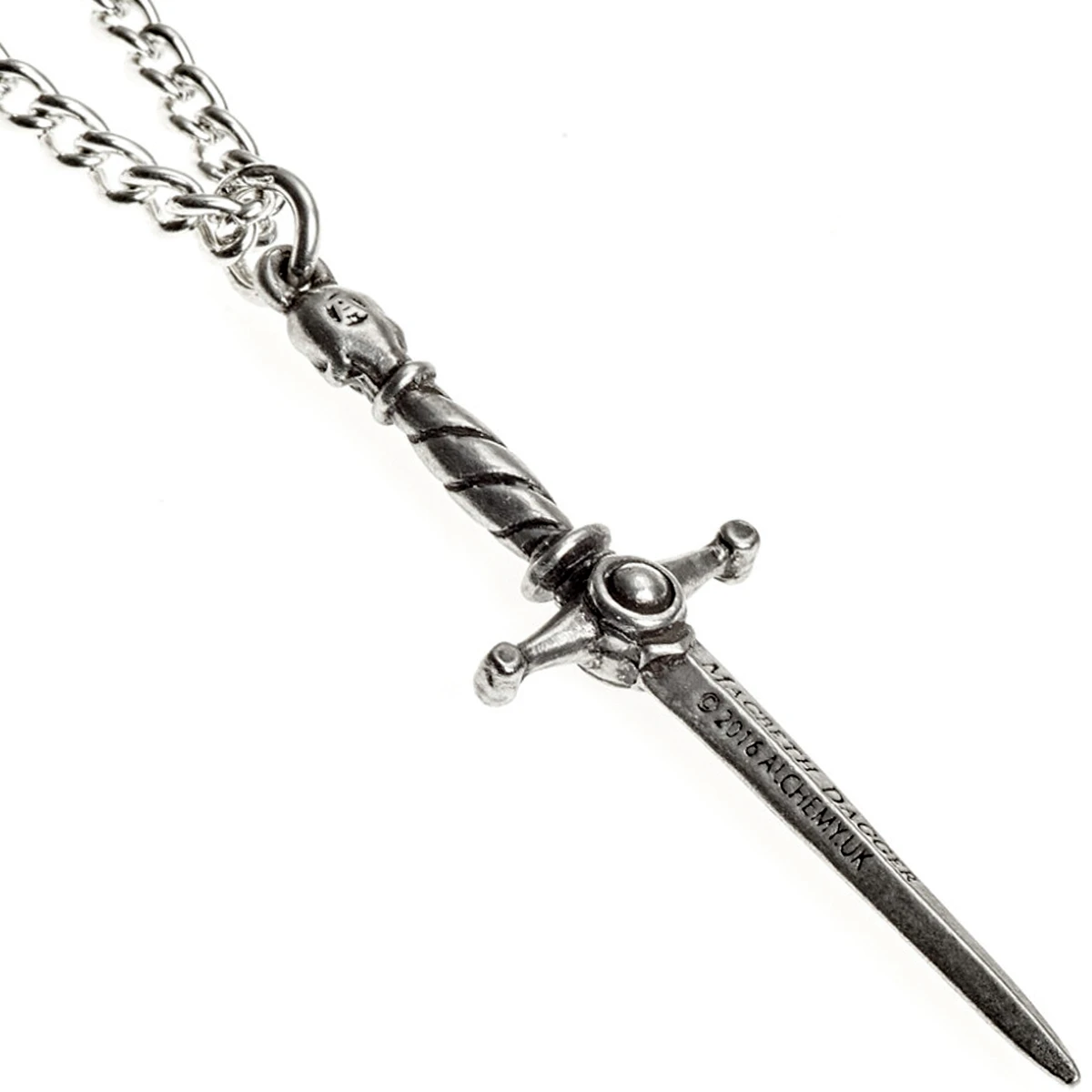 • Un petit pendentif en étain d’un poignard de style médiéval avec un petit cabochon noir sur la garde et une lame gravée.