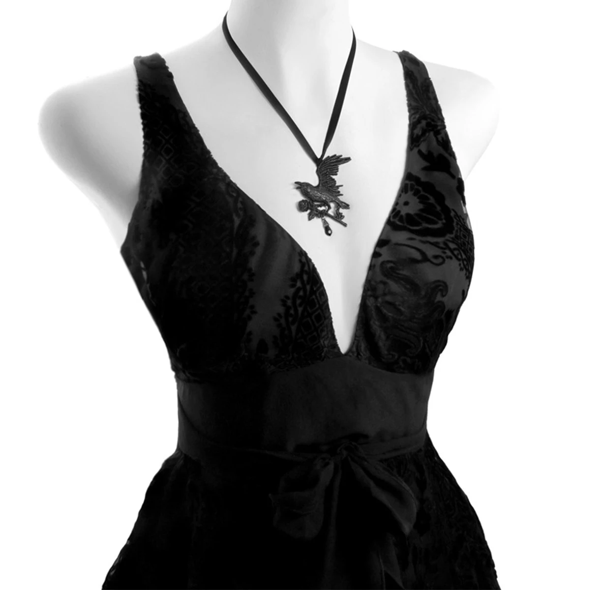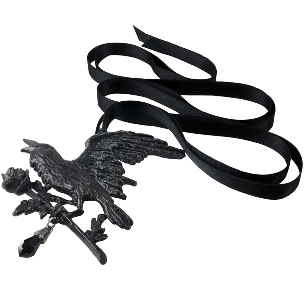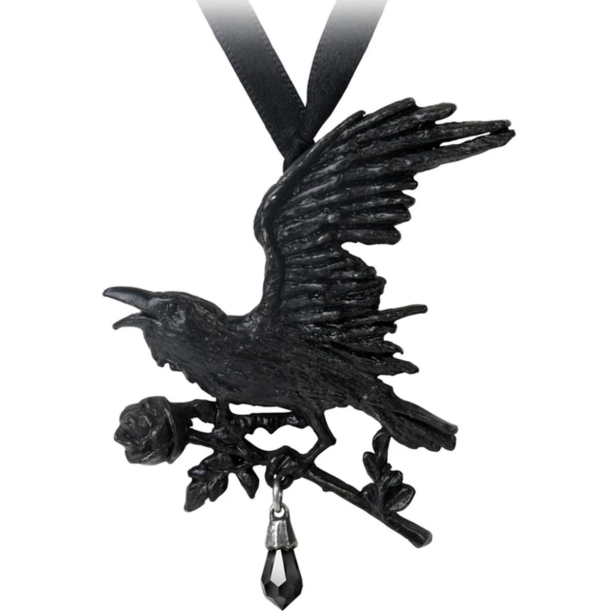 • Un pendentif profil en étain noir d’un corbeau volant avec une rose dans ses griffes, suspendant un compte-gouttes en cristal autrichien noir avec capuchon en étain bruni.