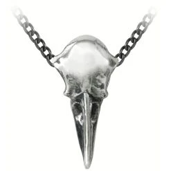 • Un pendentif tête de mort de corbeau miniature magnifiquement détaillé en étain poli, suspendu par la chaîne passant à travers les yeux du crâne.