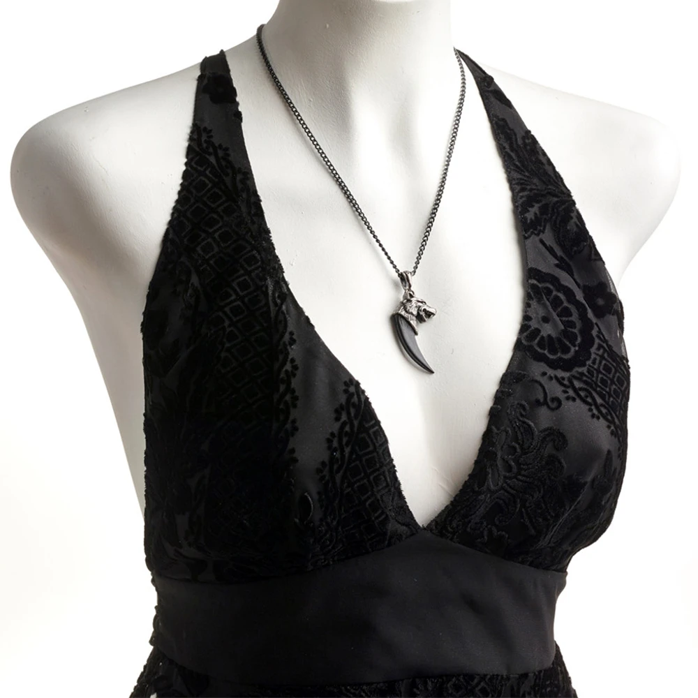 • Une tête de loup entièrement 3D, double face, sculptée de profil, sur laquelle est montée une dent de loup en étain noir.