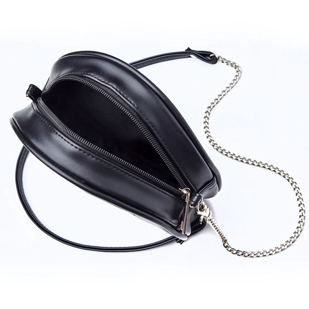 Irrésistible sac à bandoulière rond, rehaussé d’un coeur et d’un skull, en relief sur la face avant.