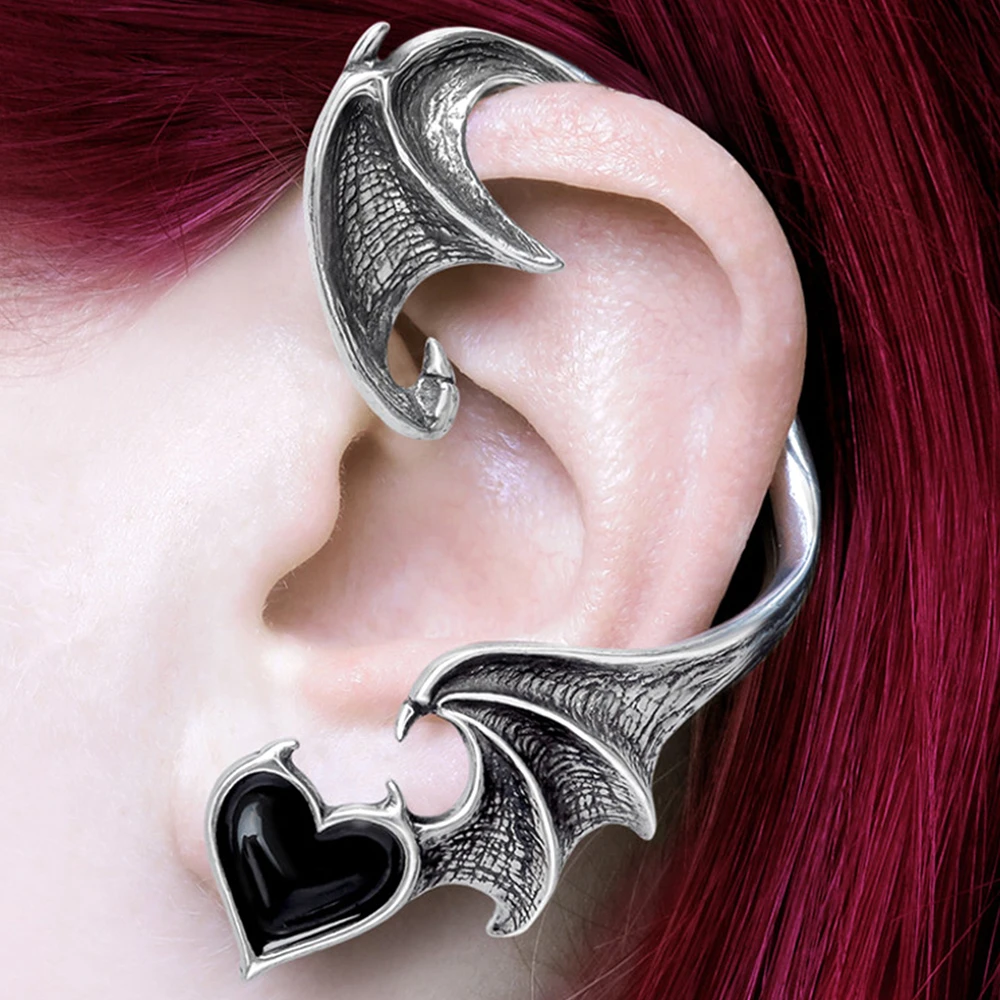 • Un tour d’oreille en forme de cœur en émail noir avec des ailes de chauve-souris et une aile enroulée sur le dessus de l’oreille.