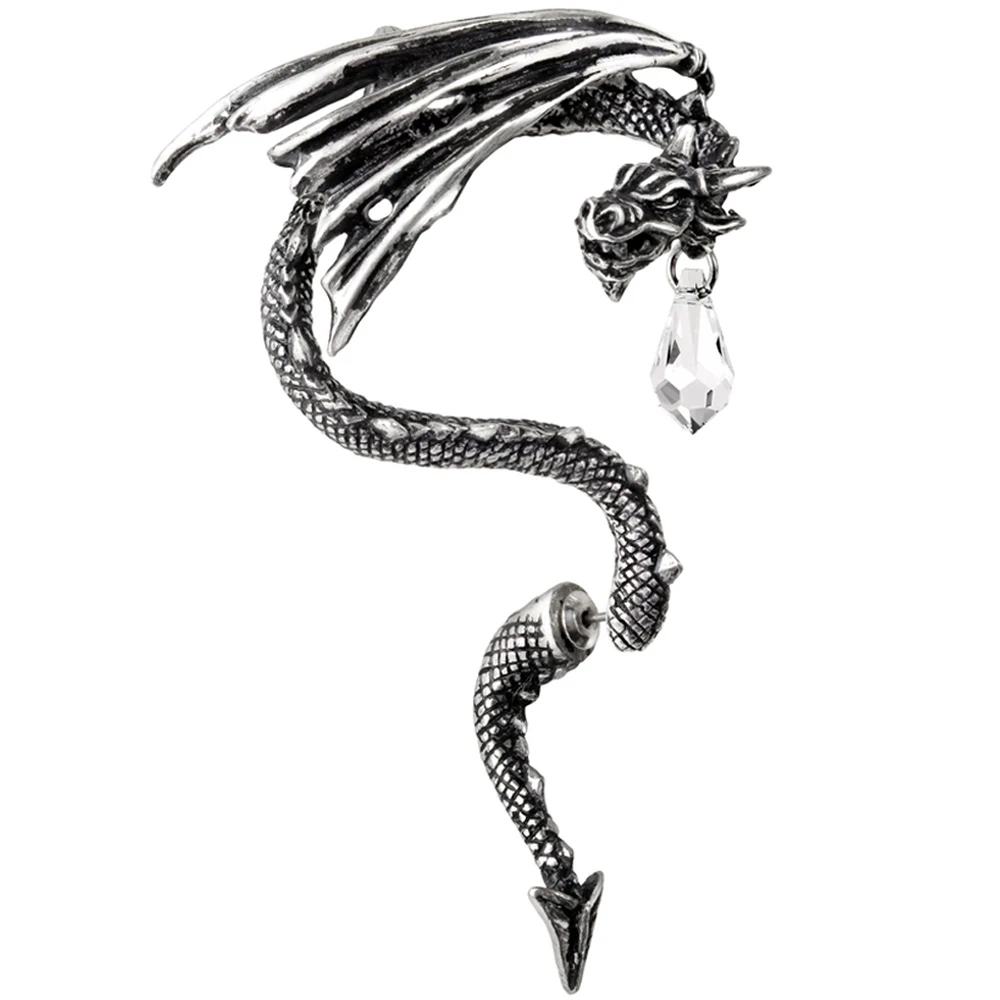 • Un faux dragon en étain qui s’enroule autour de l’oreille, tenant un compte-gouttes en cristal Swarovski suspendu.