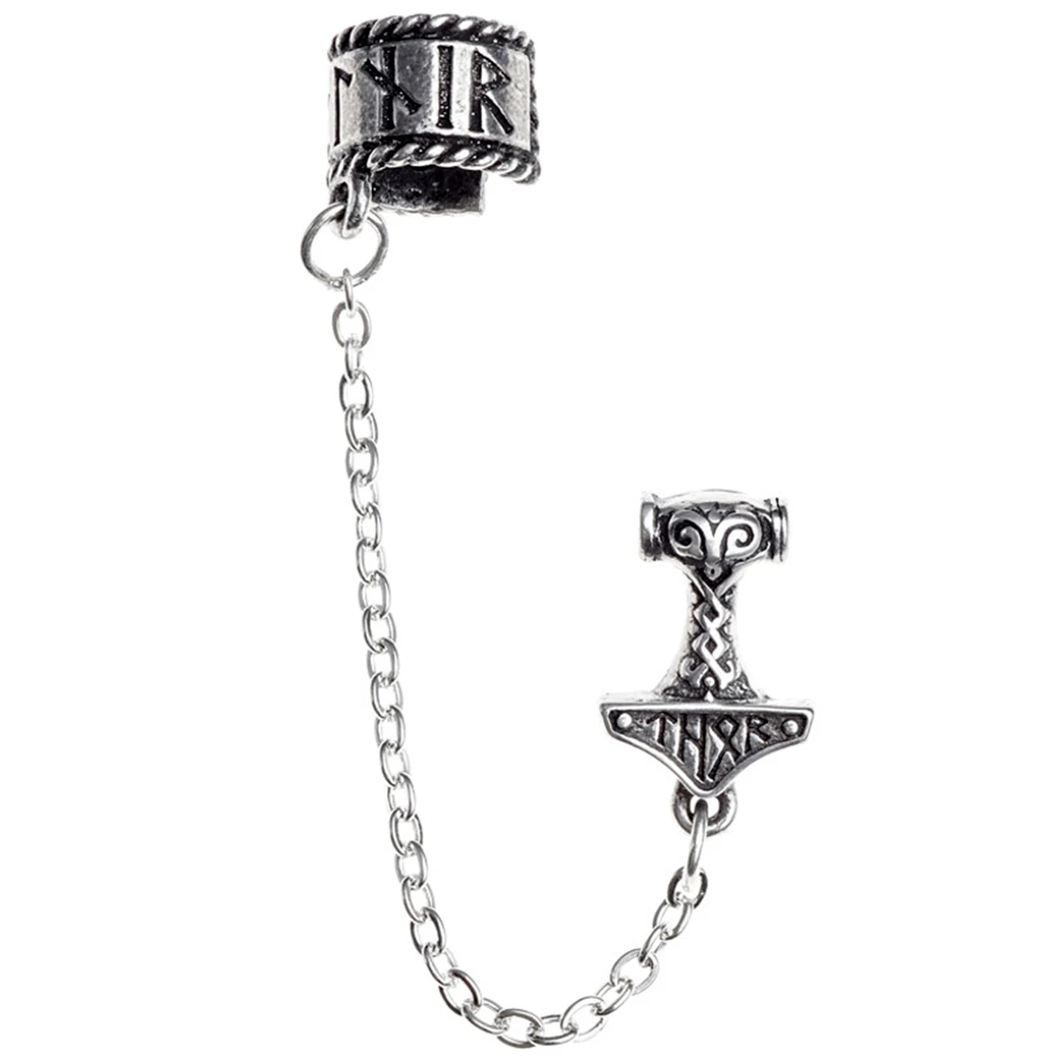 • Un brassard runique en Ă©tain pour l’oreille supĂ©rieure, enchaĂ®nĂ© Ă un goujon de marteau de Thor avec tige d’oreille en acier chirurgical.