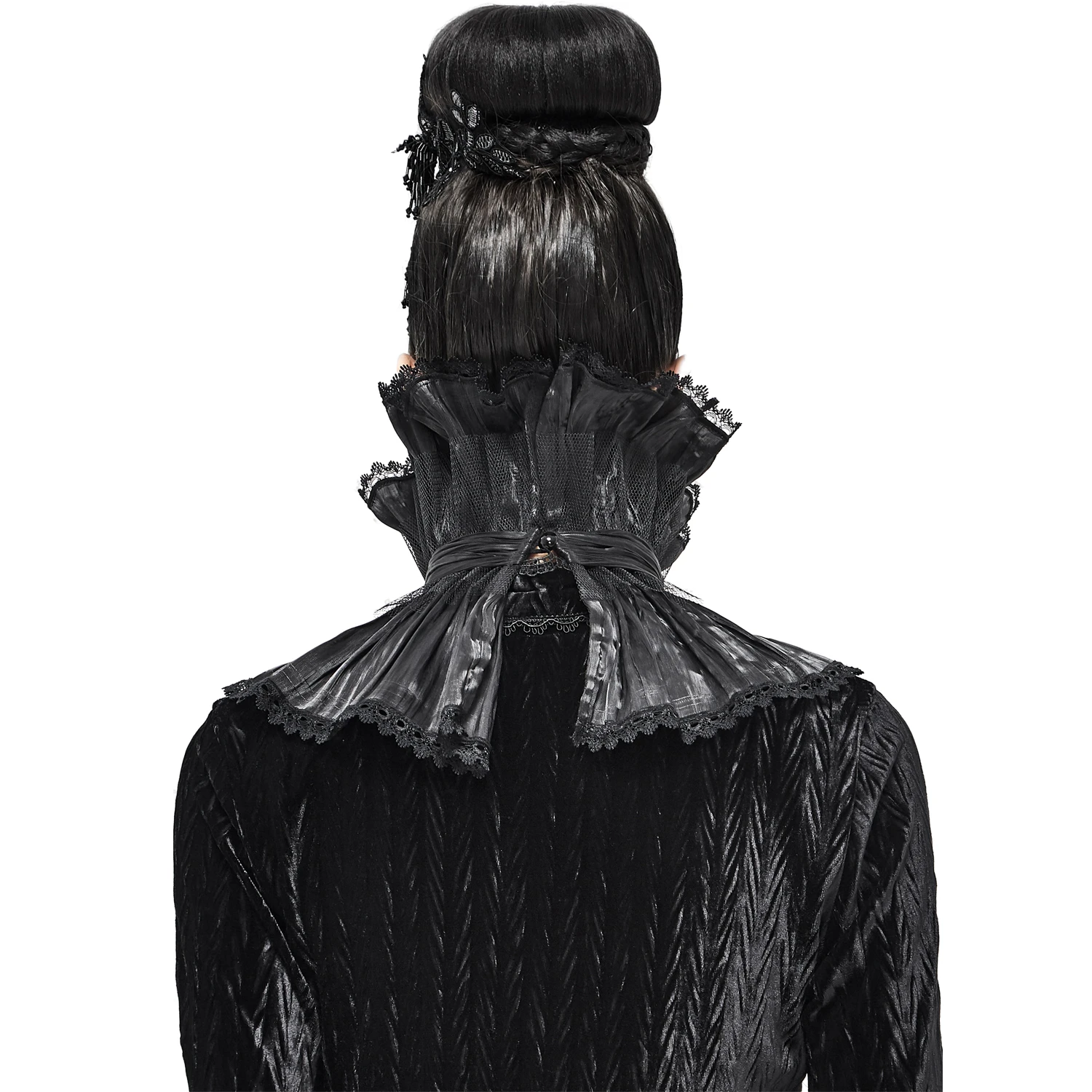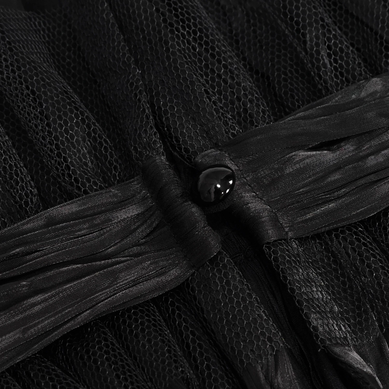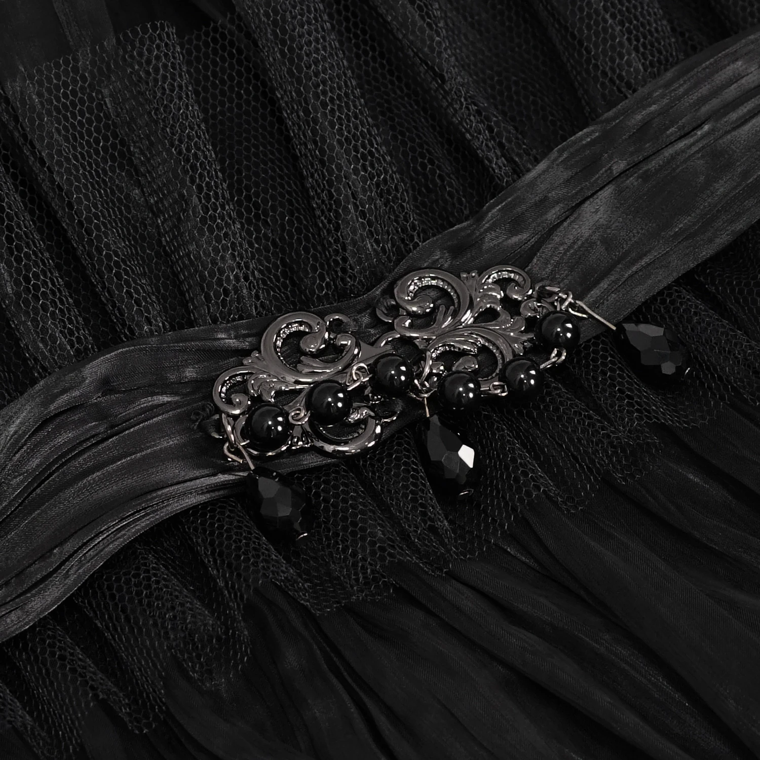 • Agrémenté d’une résille et d’une boucle de perles noires en forme de goutte