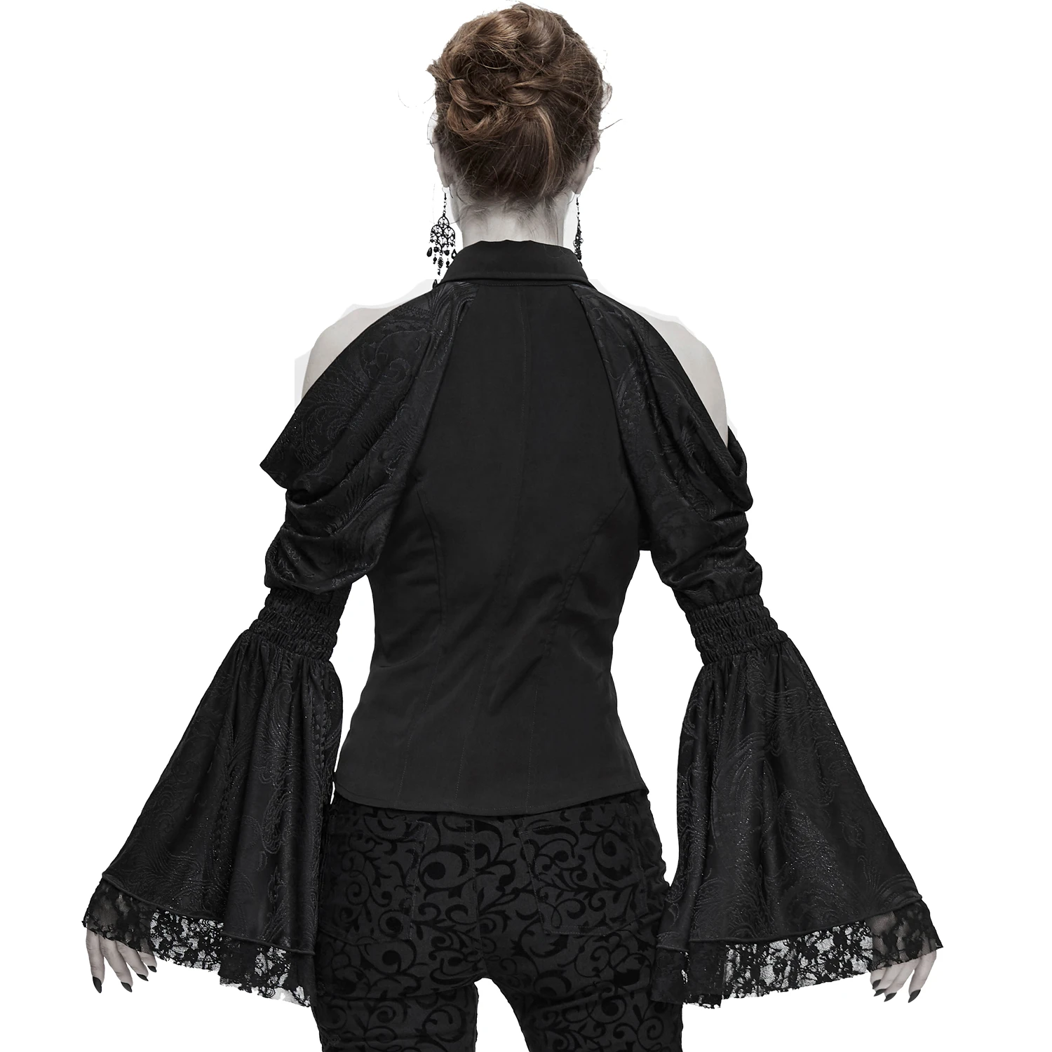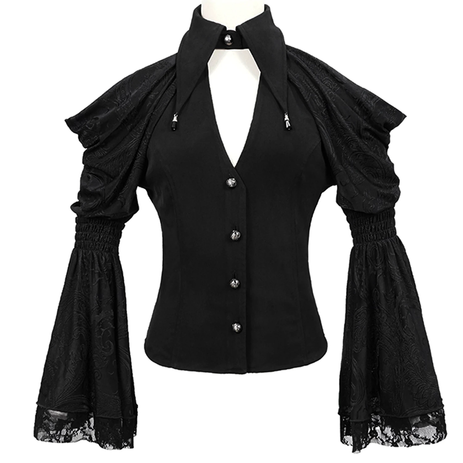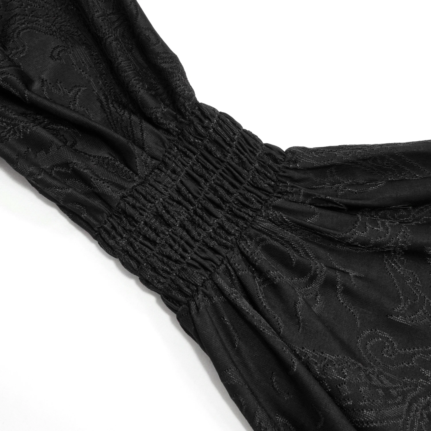 • Manches froncées aux coudes et évasées aux poignets avec un tissu à motif brocard et terminées par une délicate dentelle noire