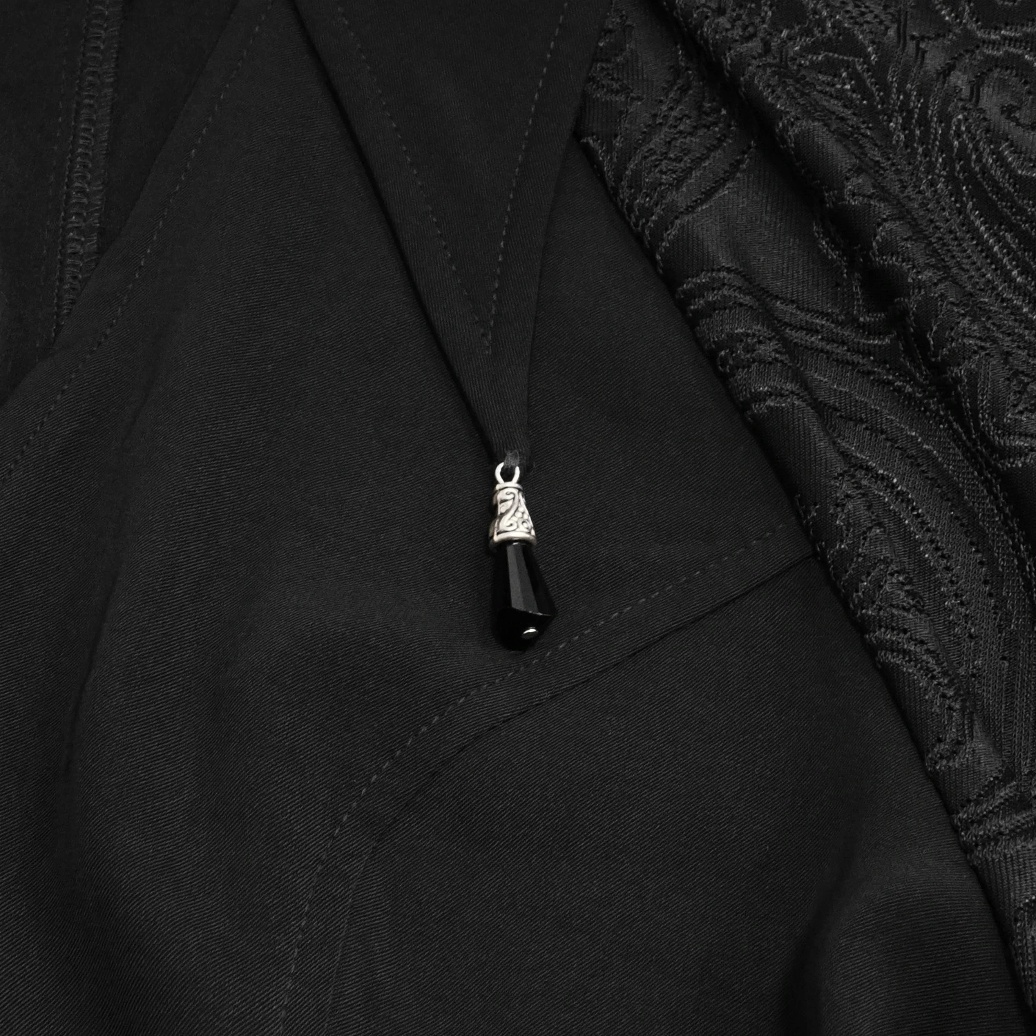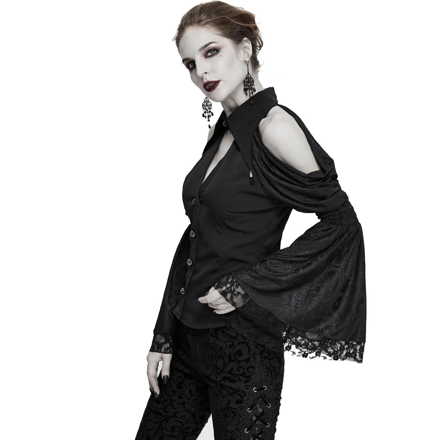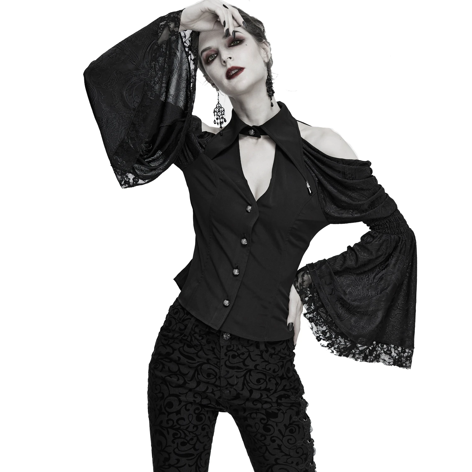 • Manches froncées aux coudes et évasées aux poignets avec un tissu à motif brocard et terminées par une délicate dentelle noire