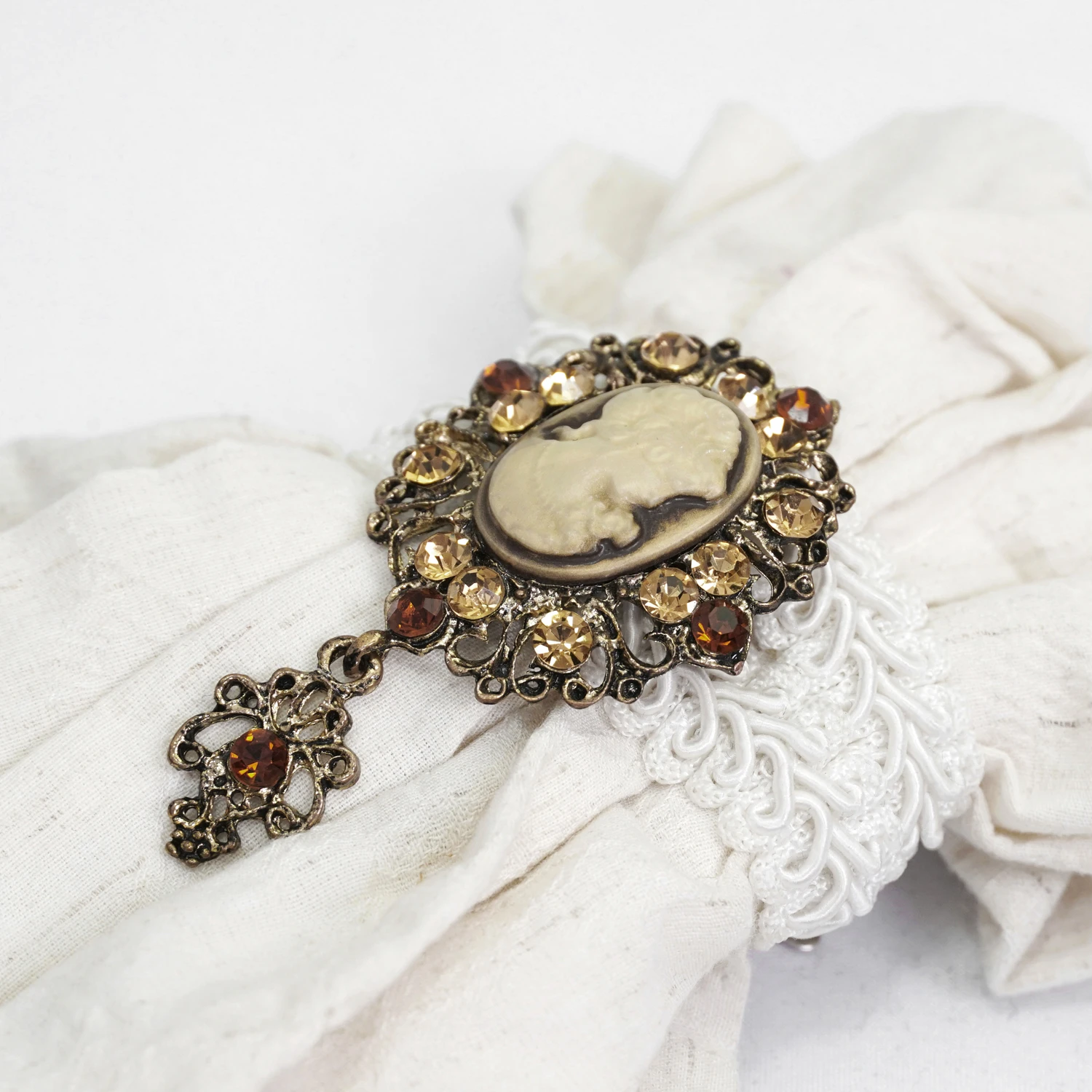 • Grande broche avec un camée de couleur ivoire placé dans un cadre en filigrane de vrilles de couleur vieil or