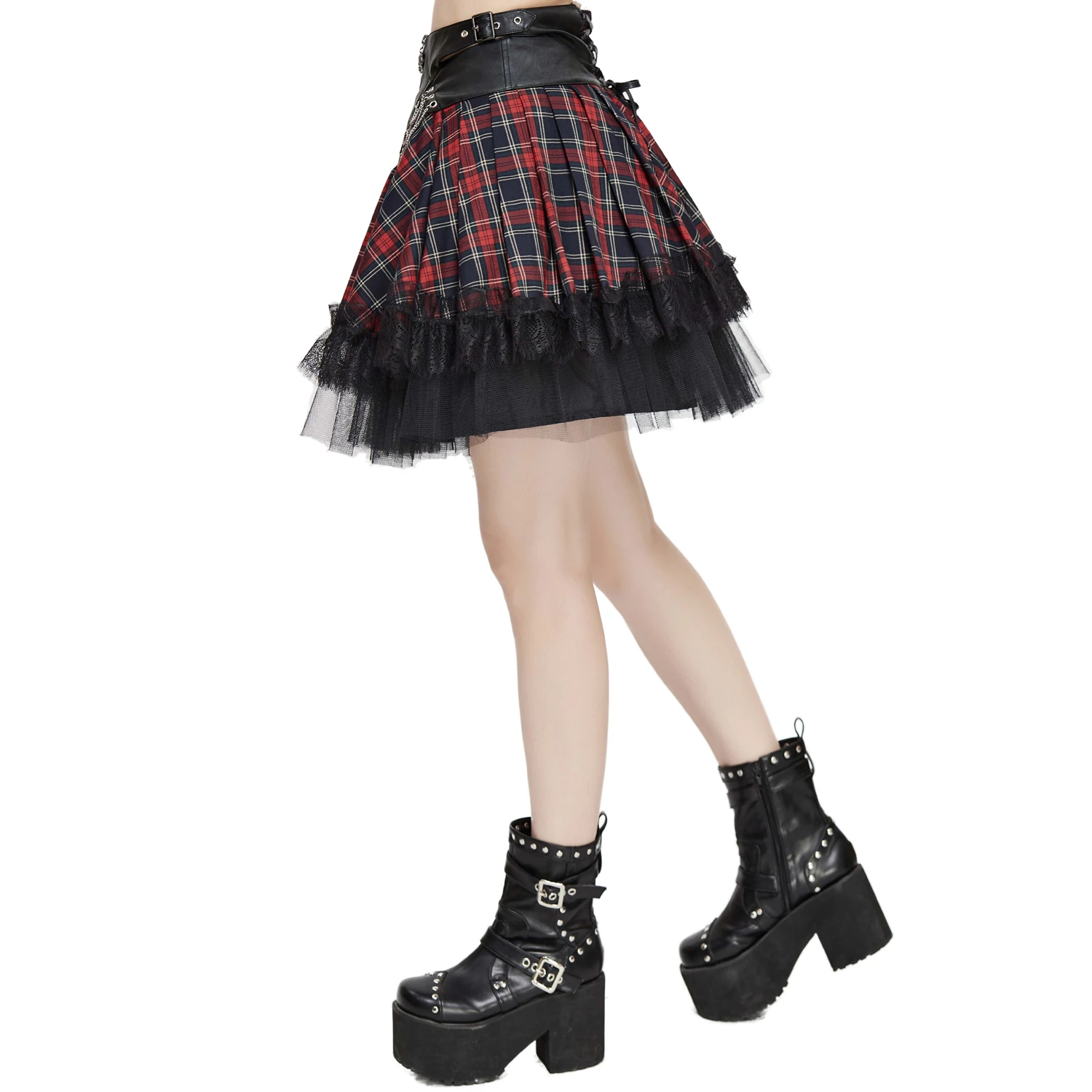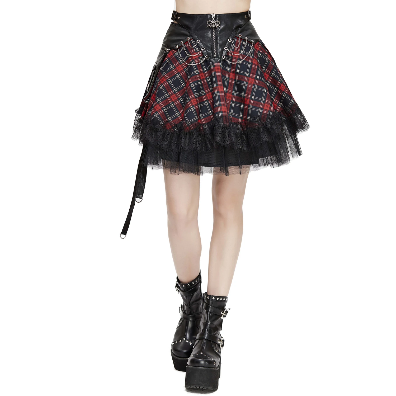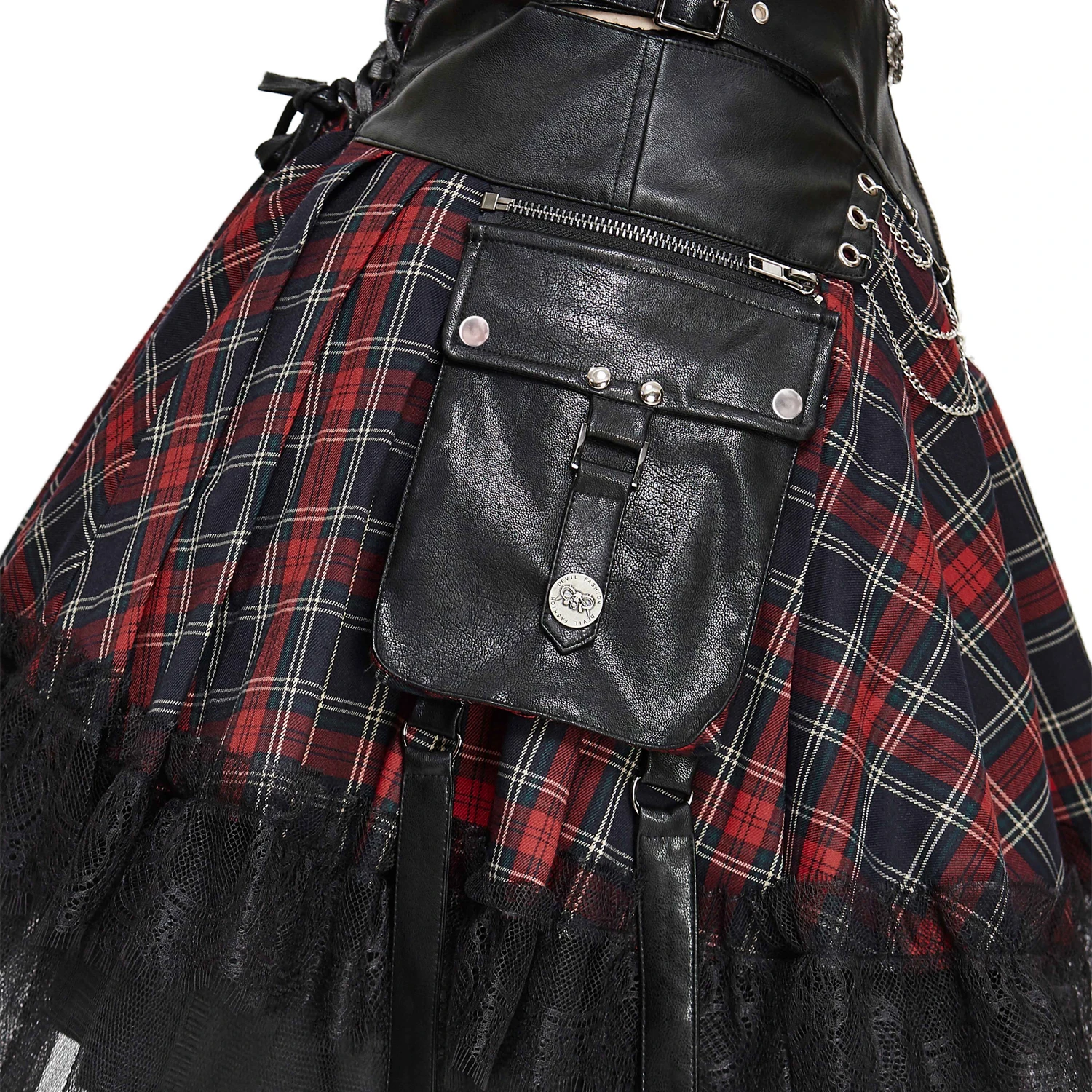 • En plaid écossais, avec la taille en simili cuir