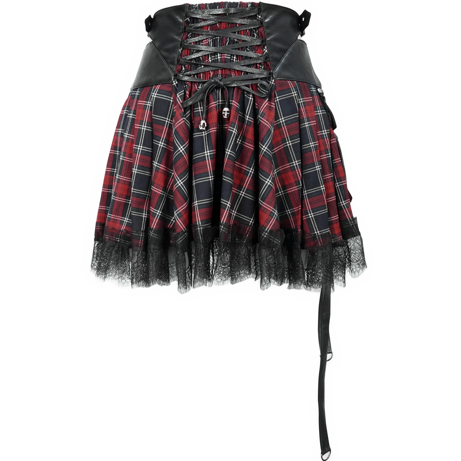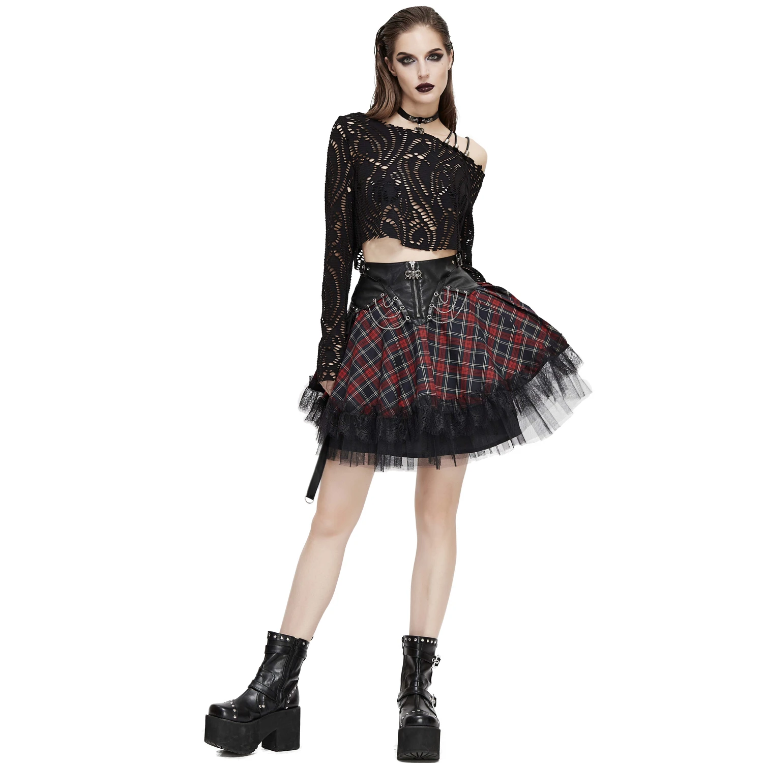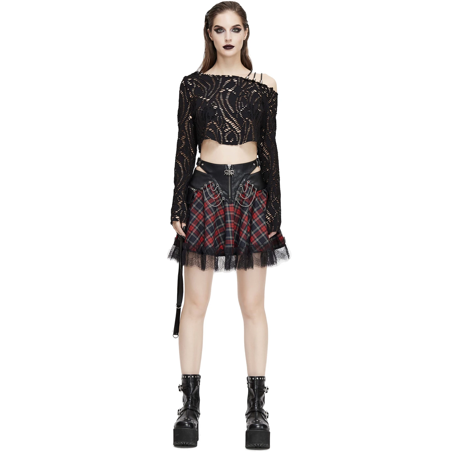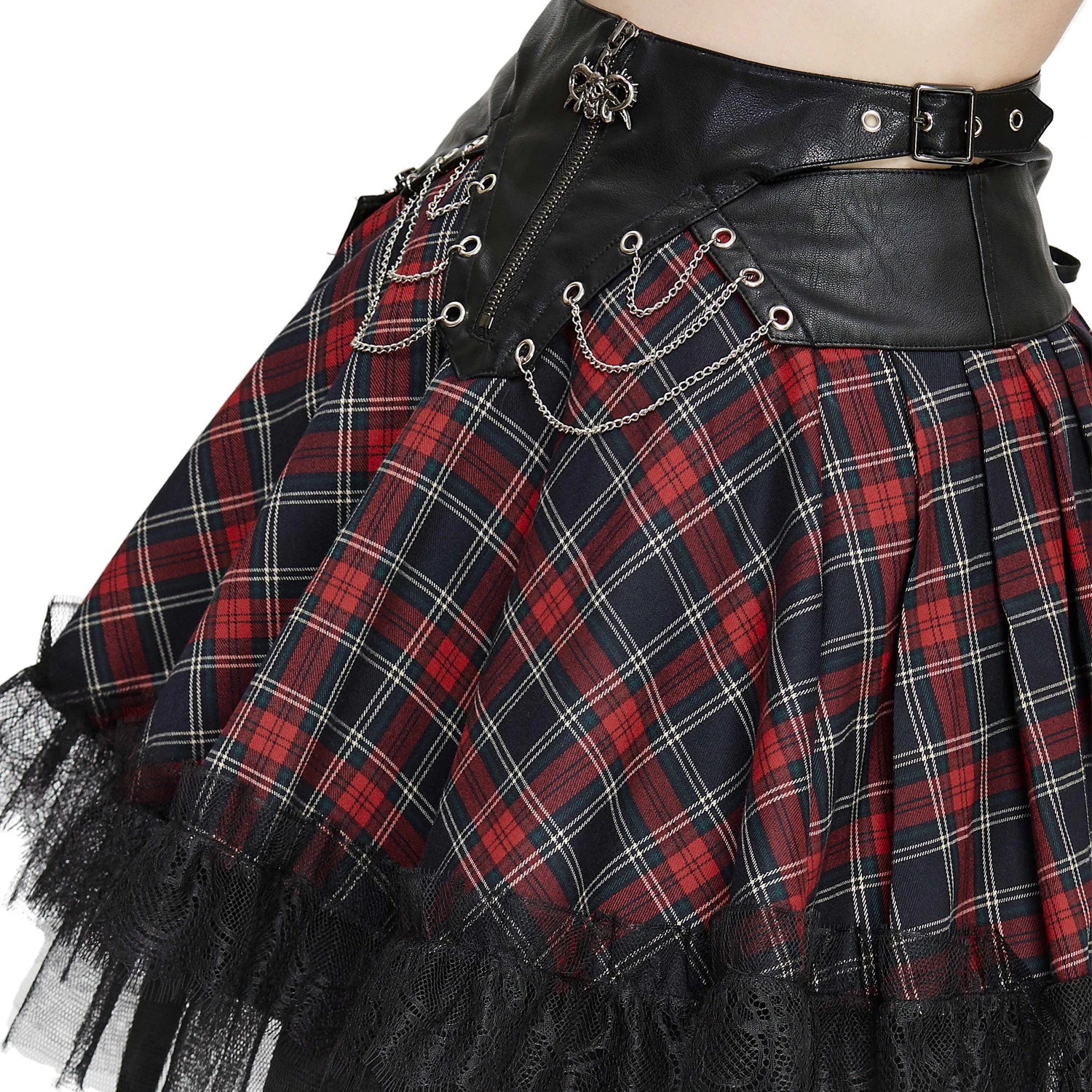 • En plaid écossais, avec la taille en simili cuir