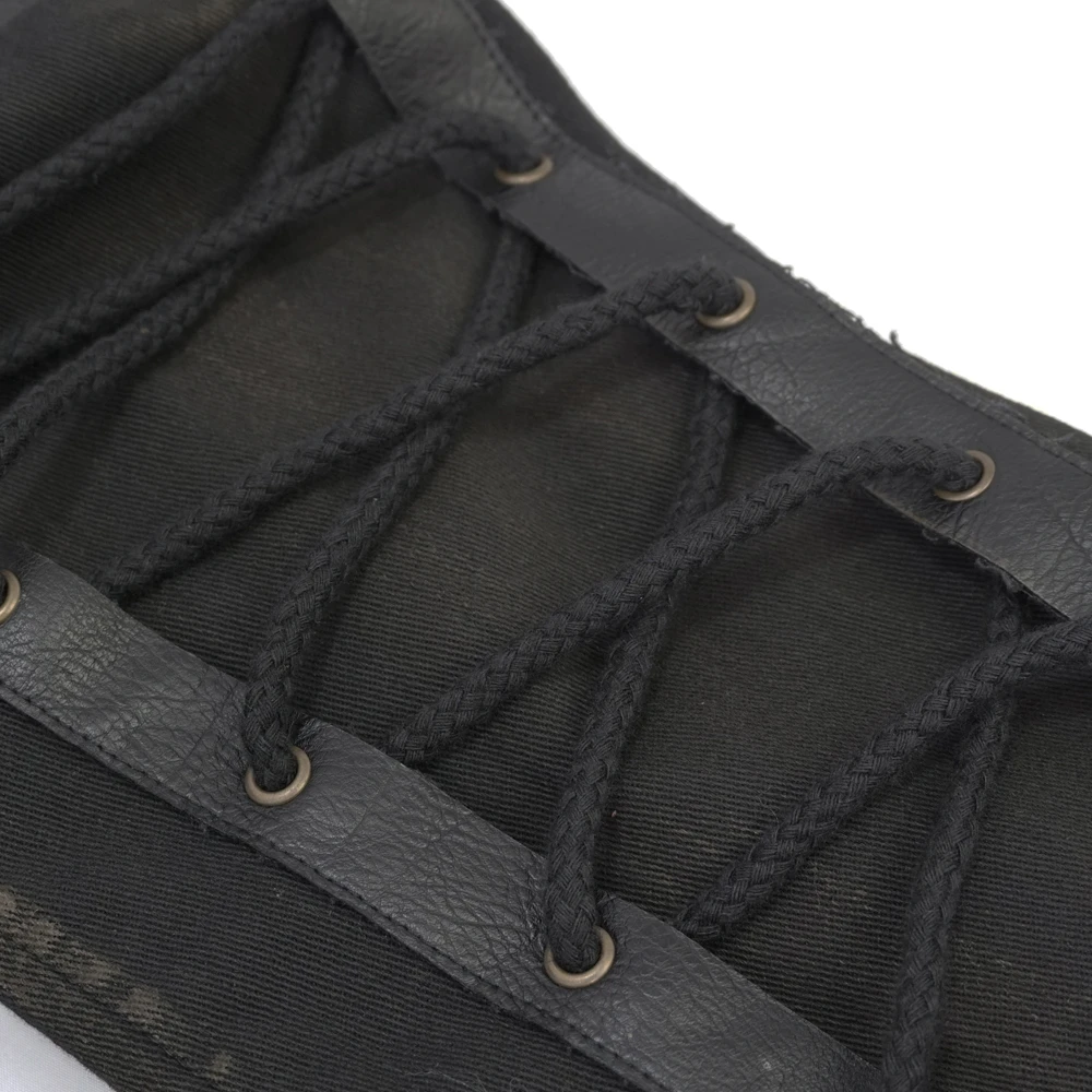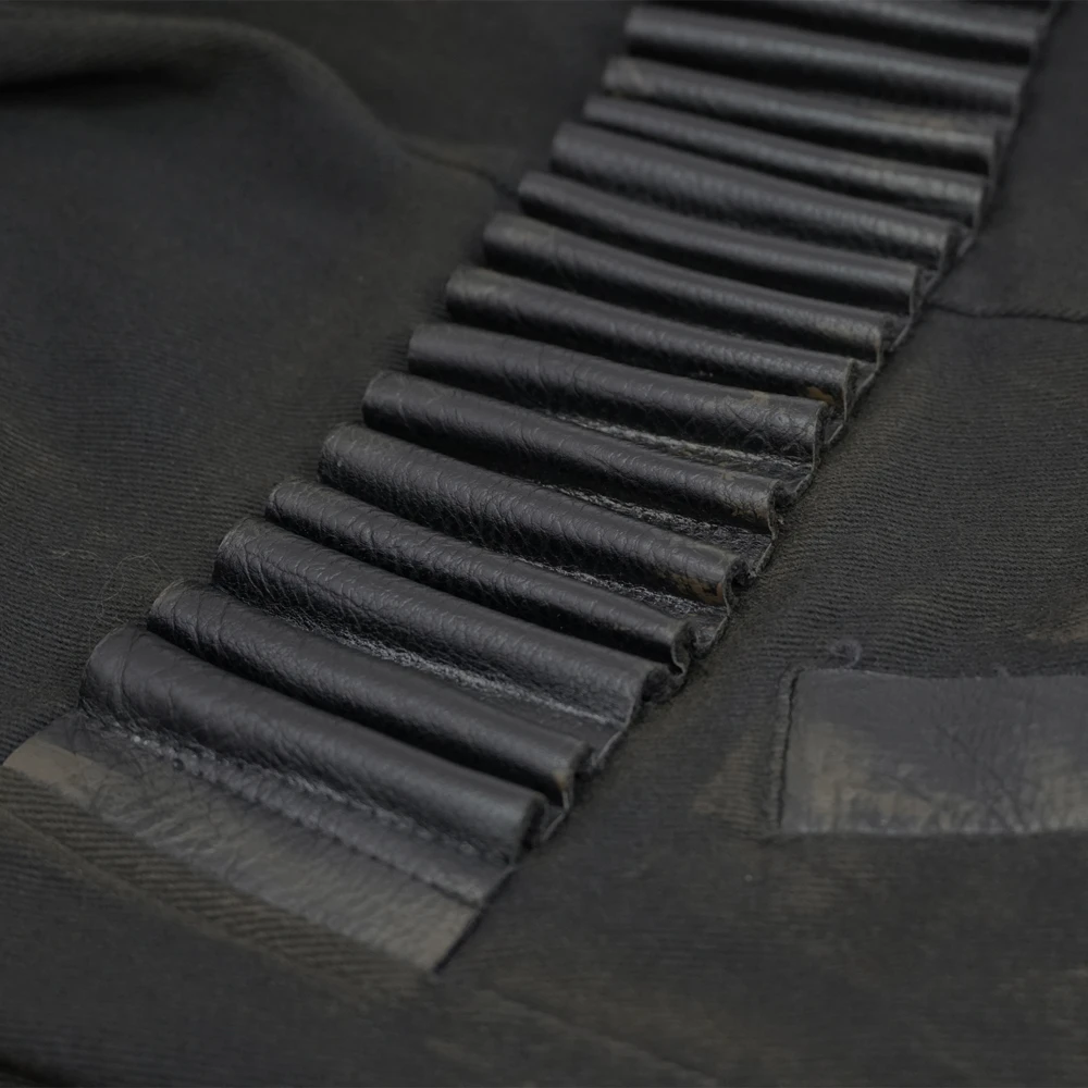 • Rabat en similicuir sur la poitrine des hommes se terminant par trois boucles métalliques dorées