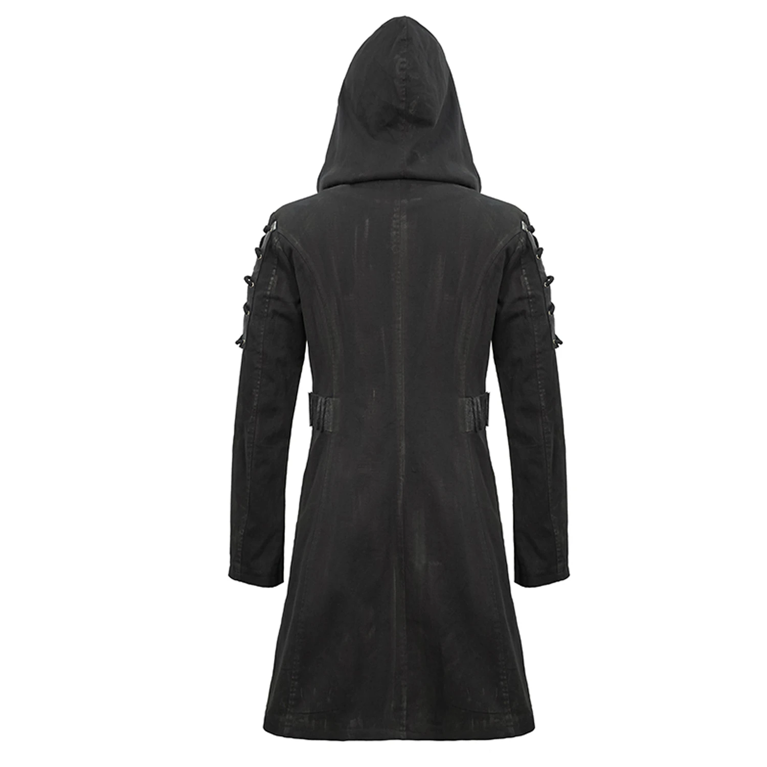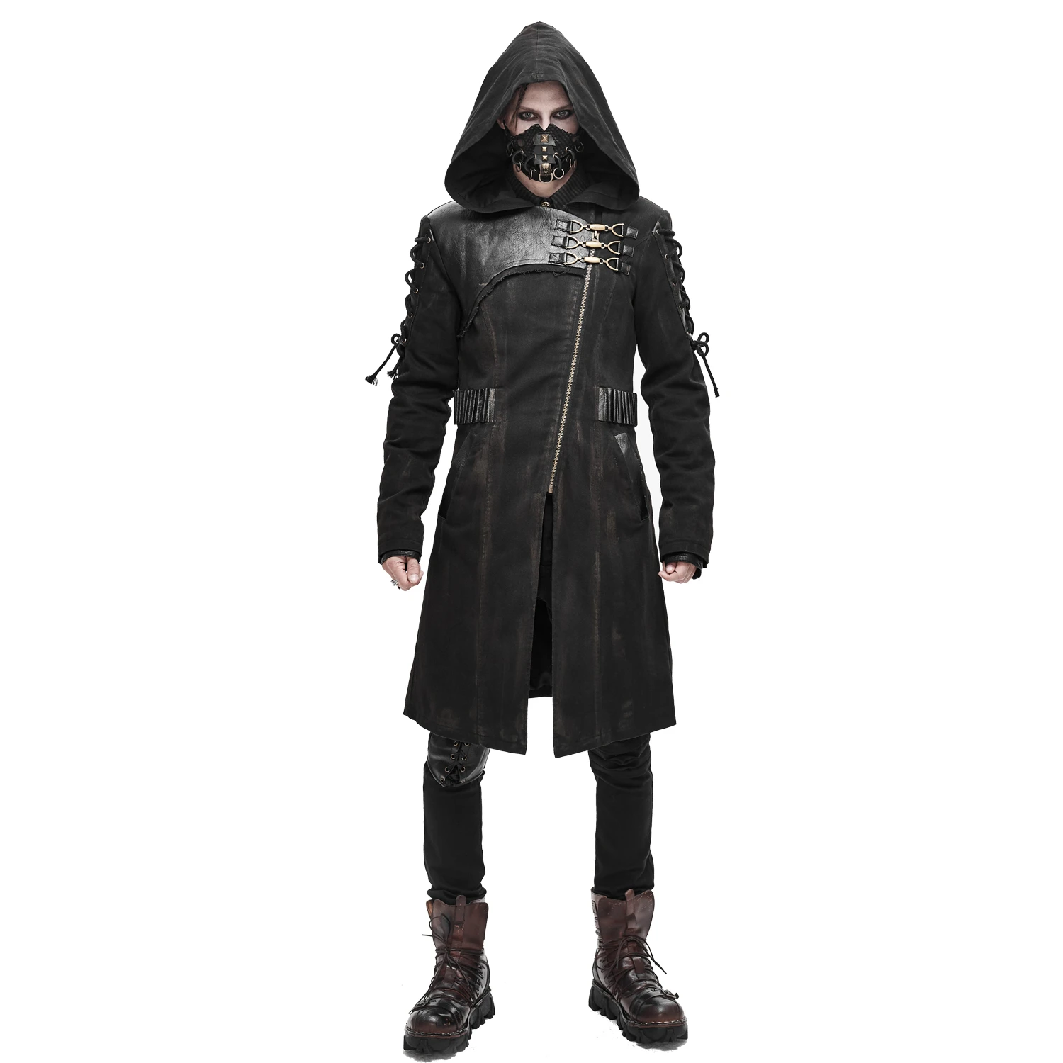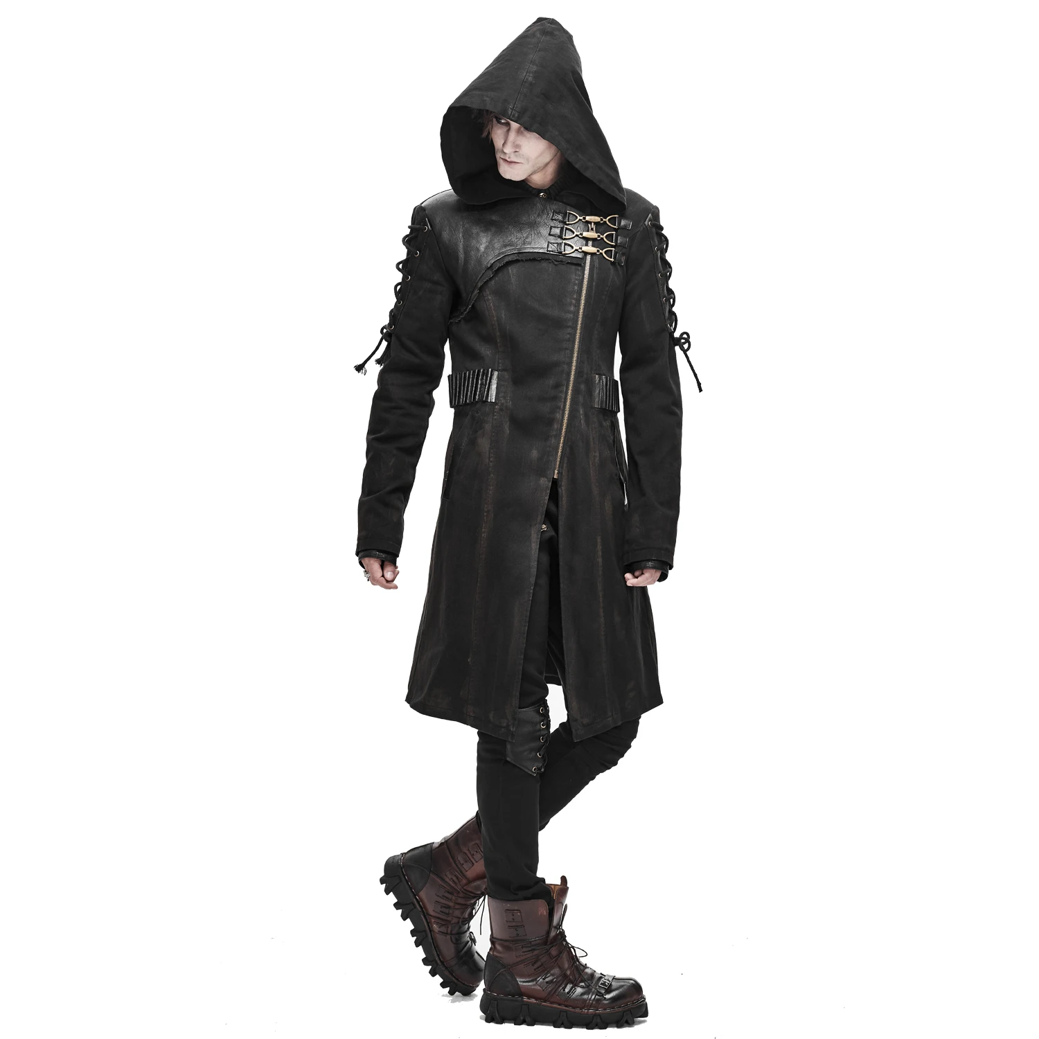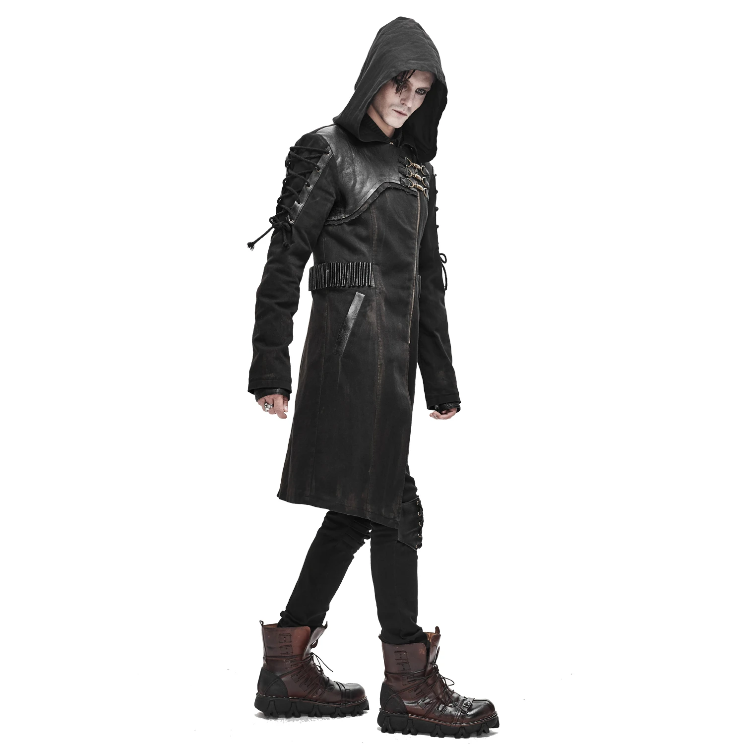 Veste longue marron-noire avec grande capuche, ceinture imitation bullets, avec finitions en simili cuir