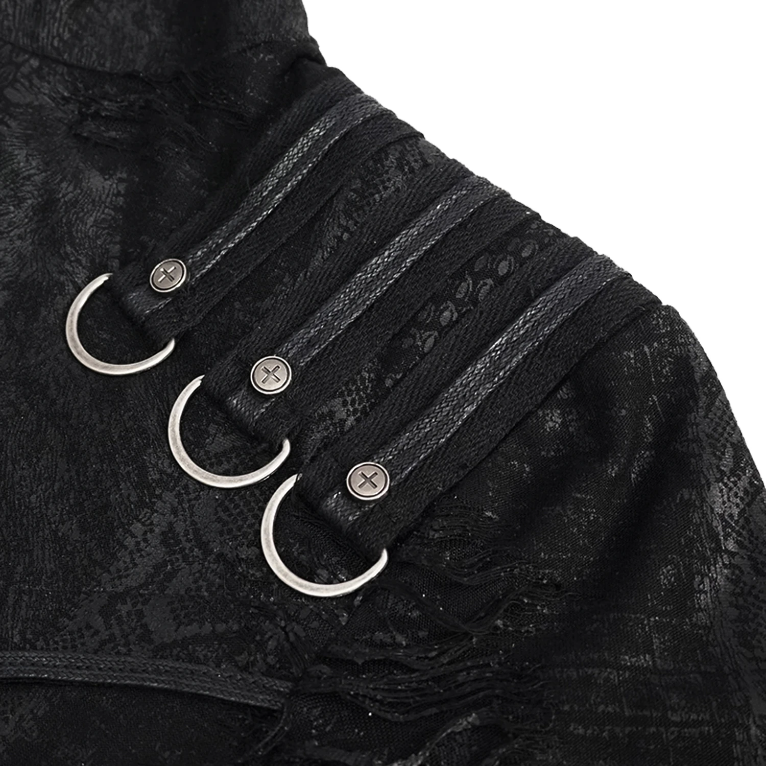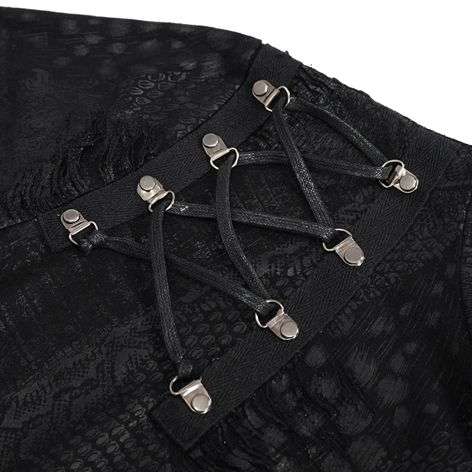 • Laçage sur l’épaule droite à l’avant, trois rivets à l’arrière