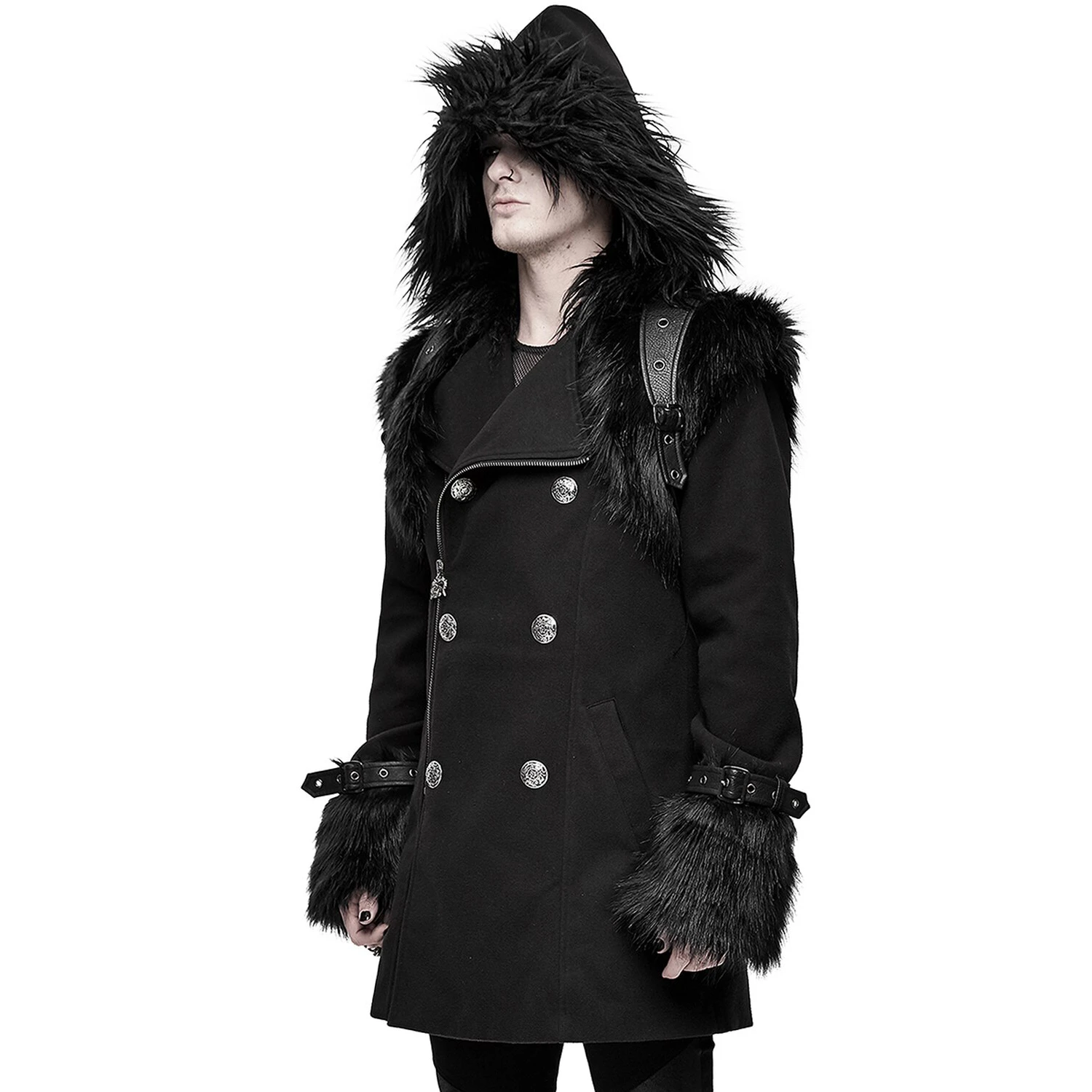 Veste d’hiver 2 en 1 comprenant un caban à double boutonnage en polyester effet laine épais, et un harnais d’épaule amovible en similicuir et fausse fourrure noirs