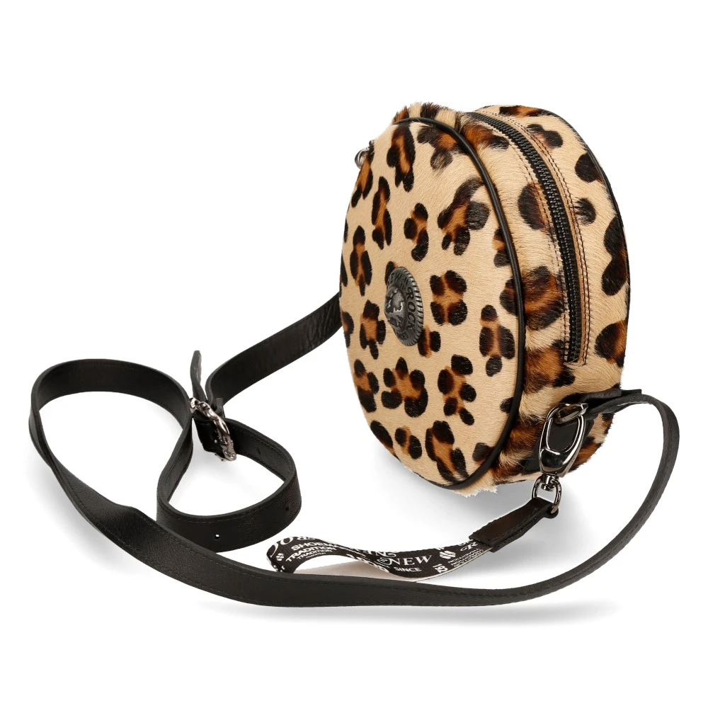Sac à bandoulière rond, en léopard, avec logo New Rock sur la face avant.