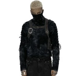 Gilet pour homme gothique noir avec détails en cuir synthétique et fermeture à crochet à l’avant.