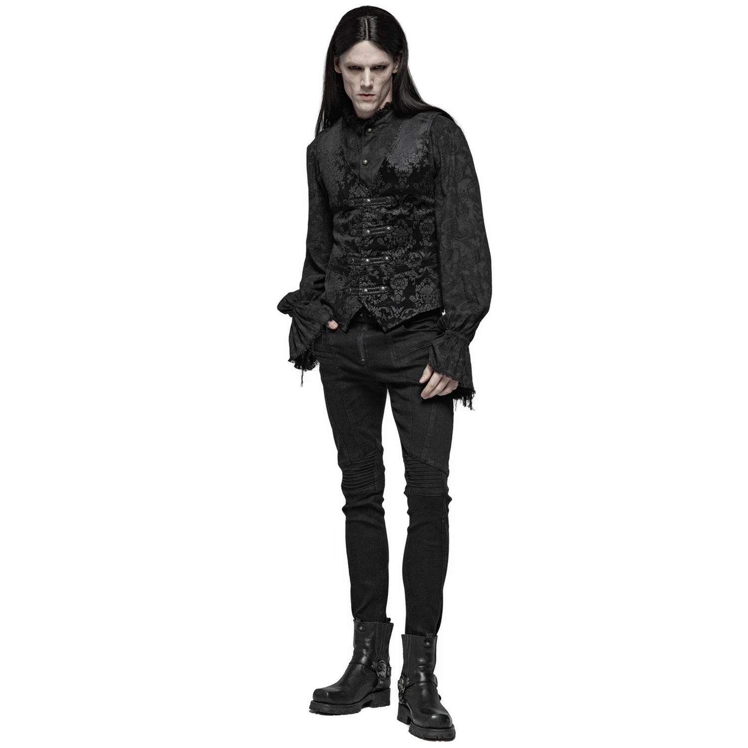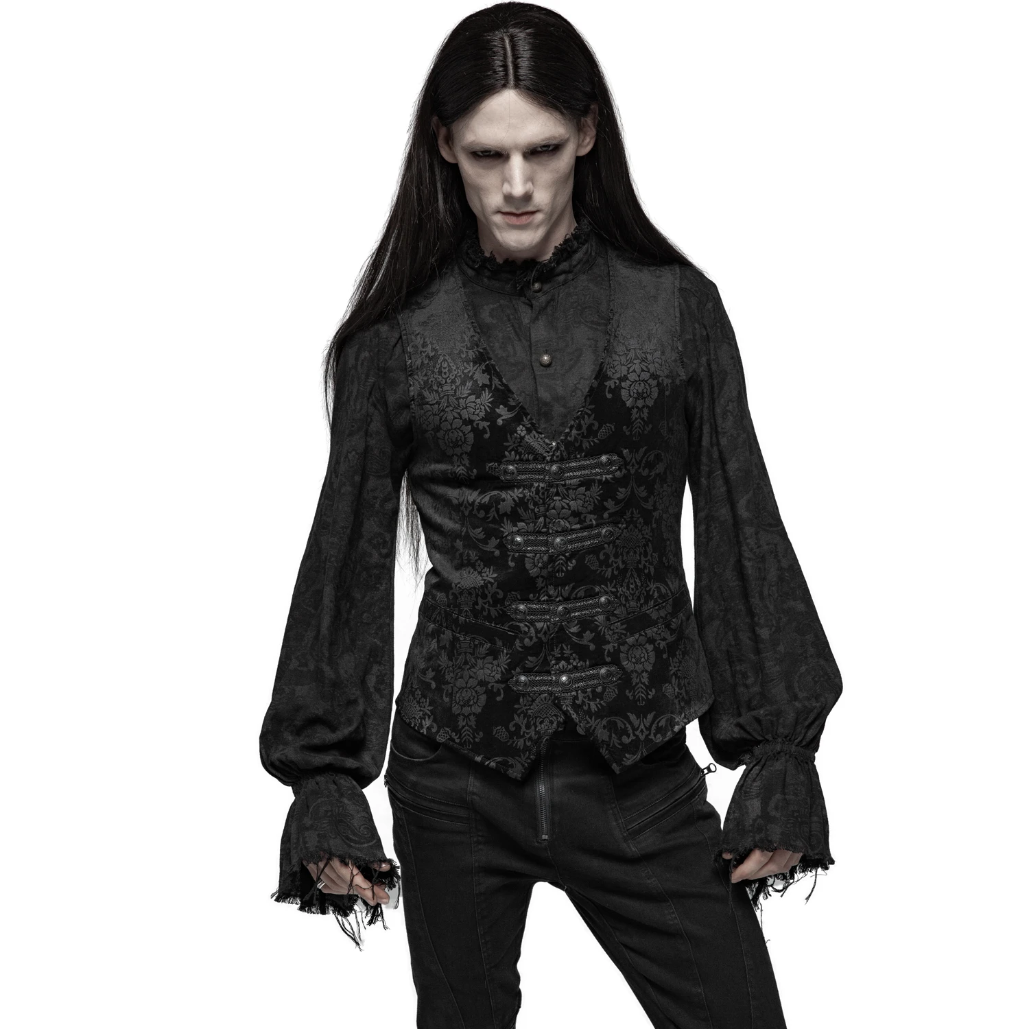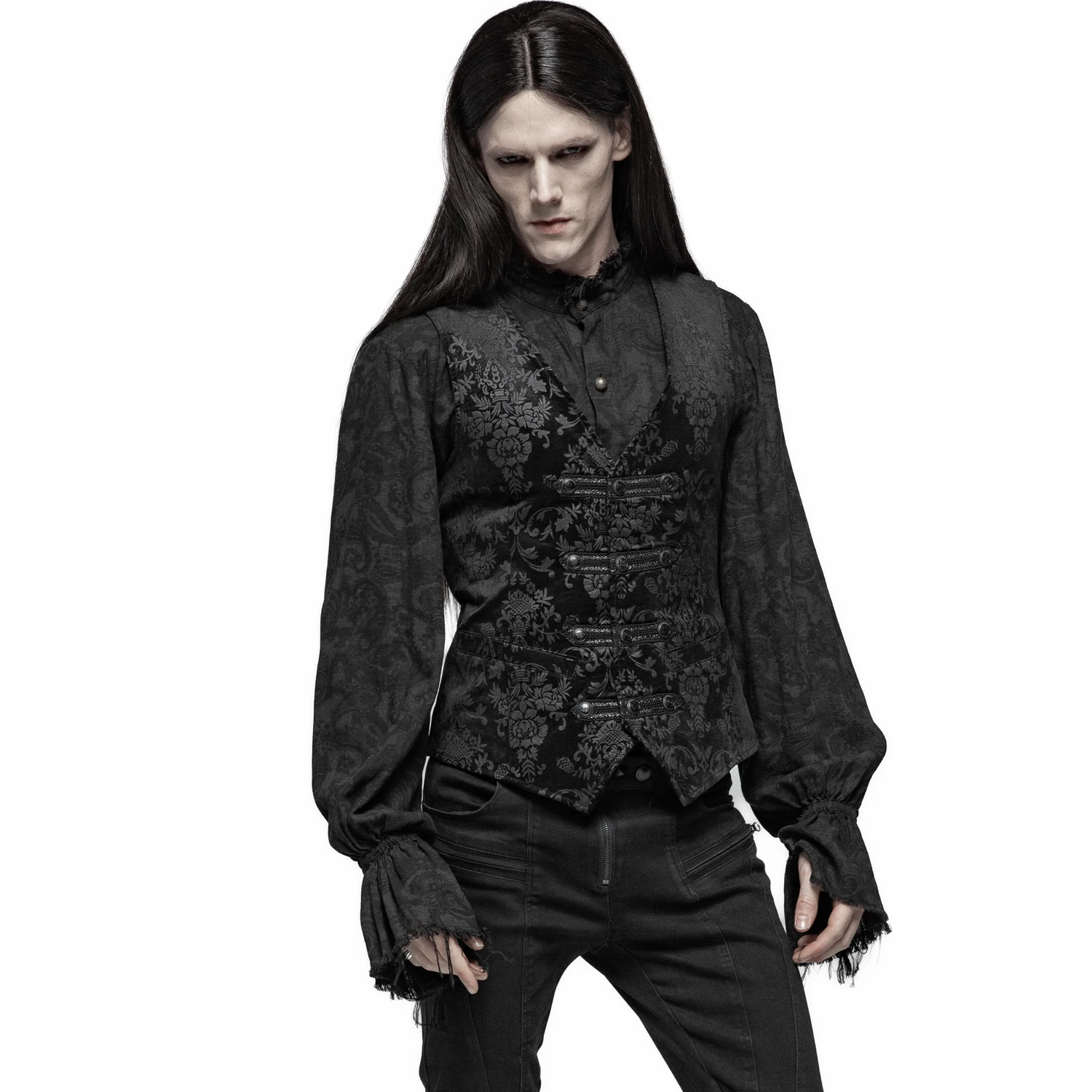 Gilet damassé noir-gris pour hommes de style gothique victorien, orné de sangles en ruban de satin sur la fermeture frontale et de boutons noirs estampés.