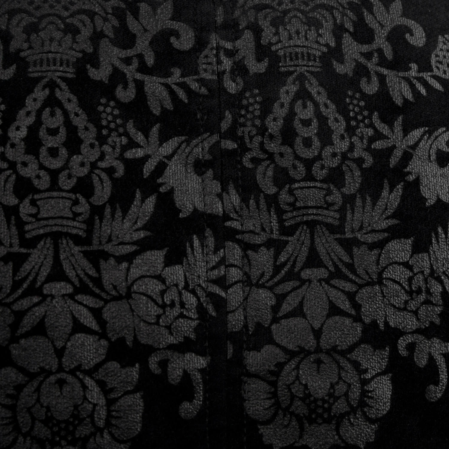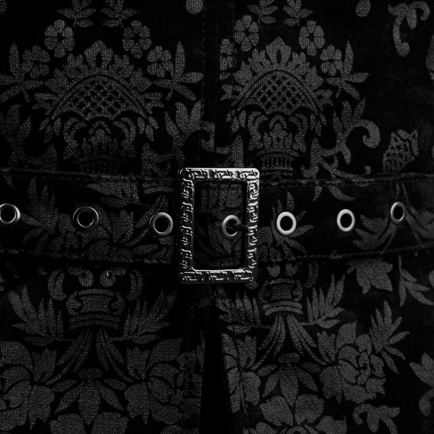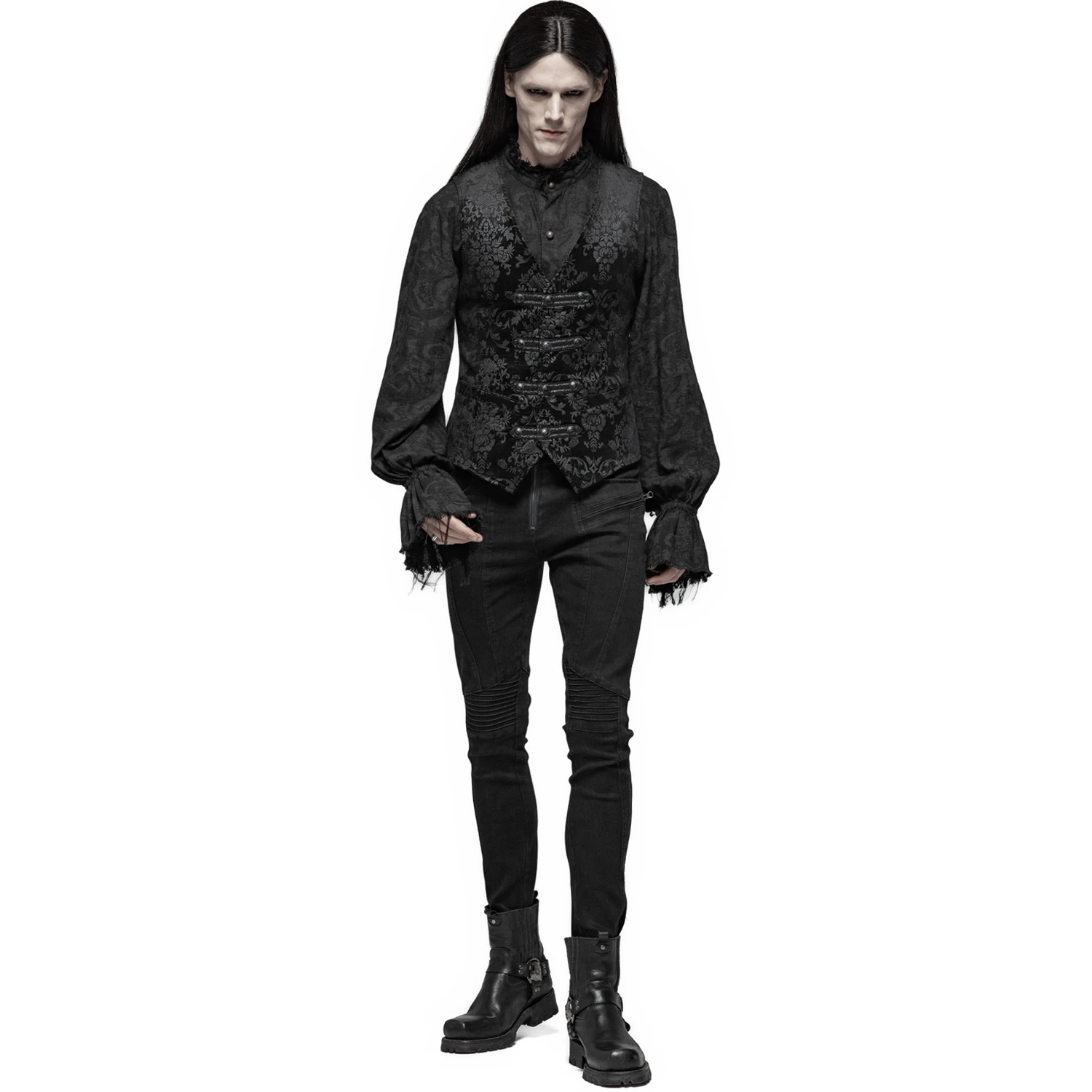 Gilet damassé noir-gris pour hommes de style gothique victorien, orné de sangles en ruban de satin sur la fermeture frontale et de boutons noirs estampés.