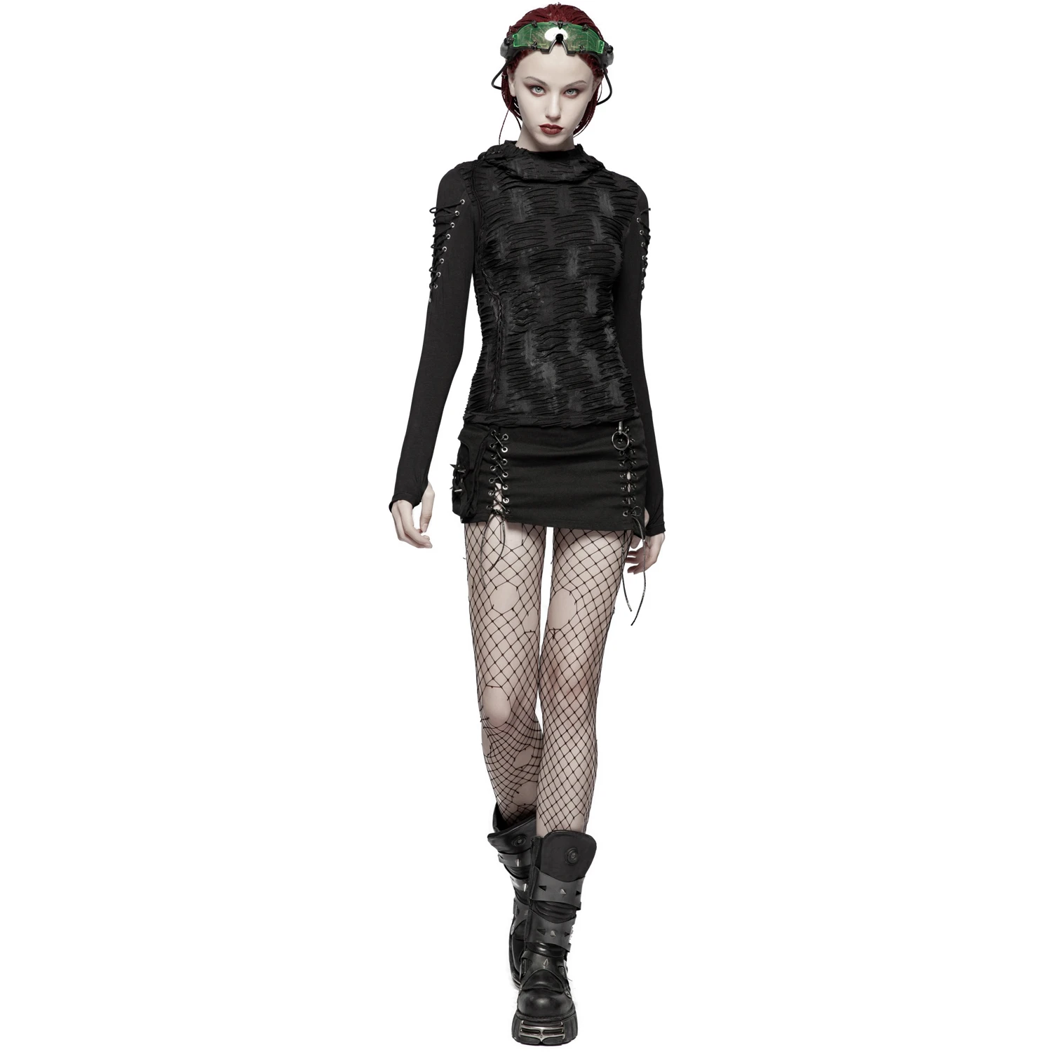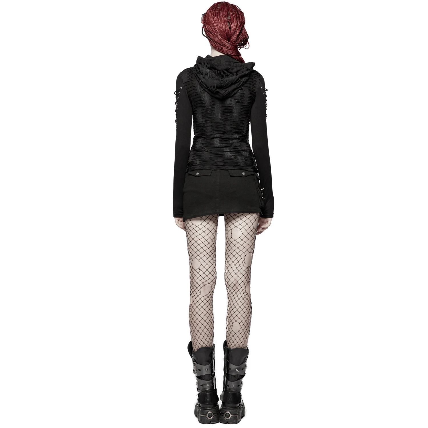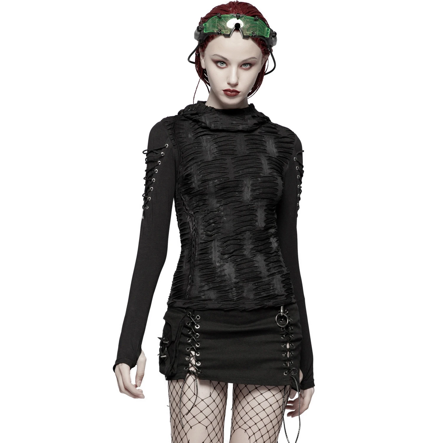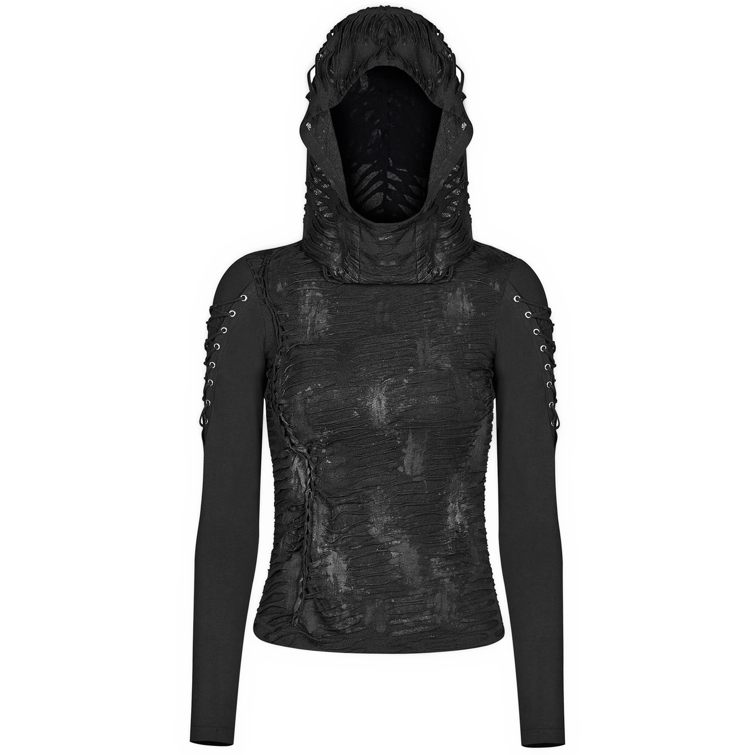 Haut à manches longues de style gothique post-apocalyptique et industriel avec capuche et épaules lacées.