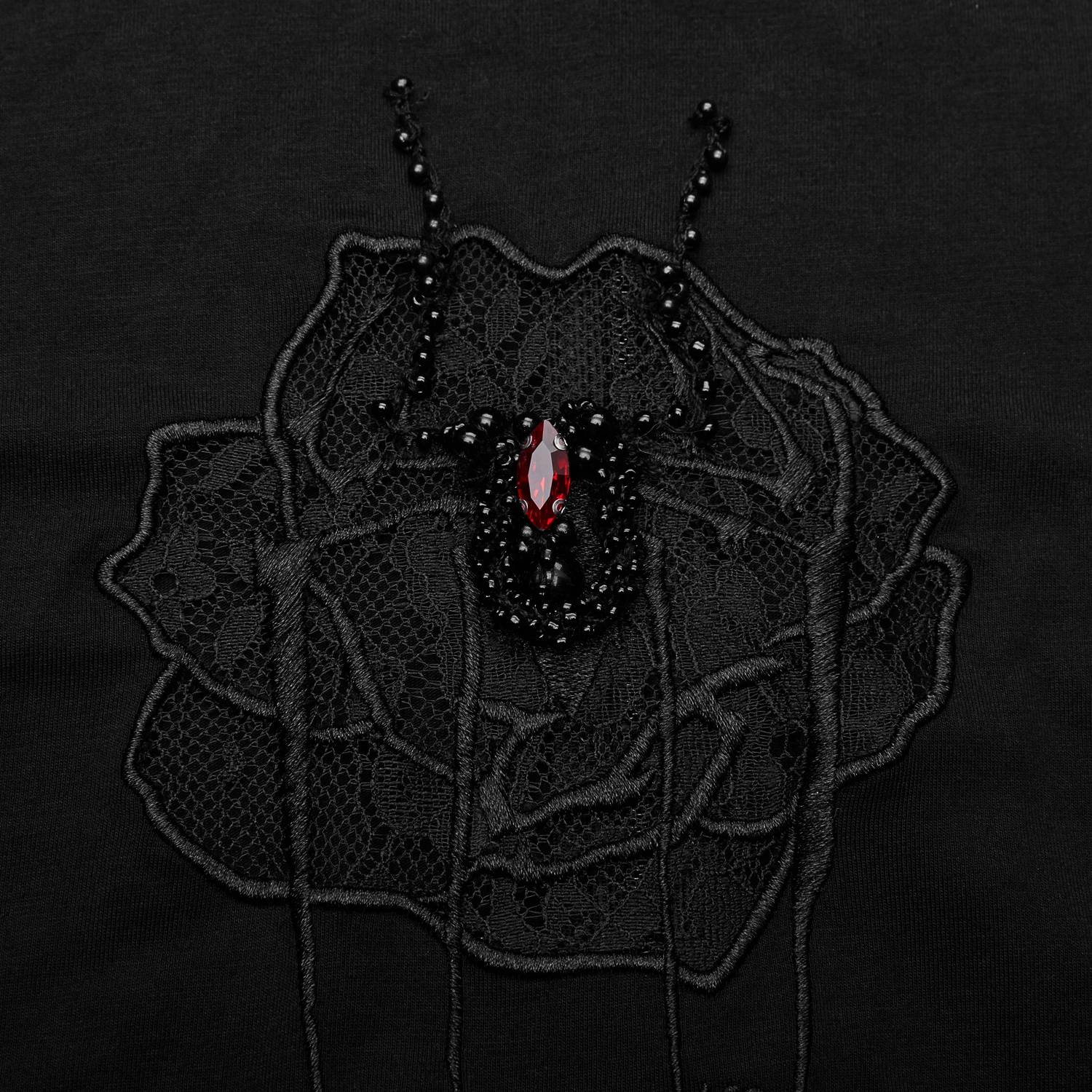 • Poitrine ornée d’une araignée en perles noires avec une pierre rouge sang en son centre