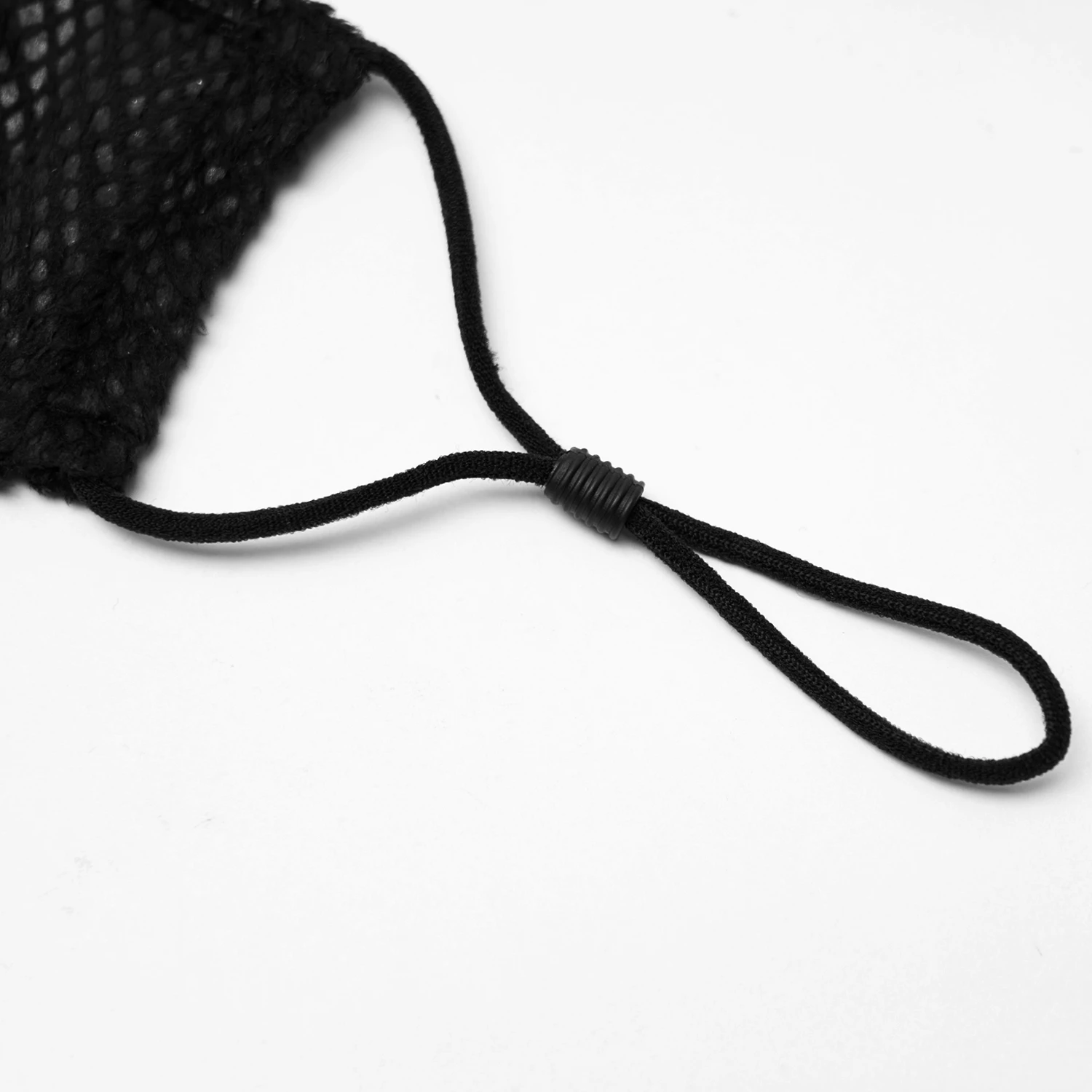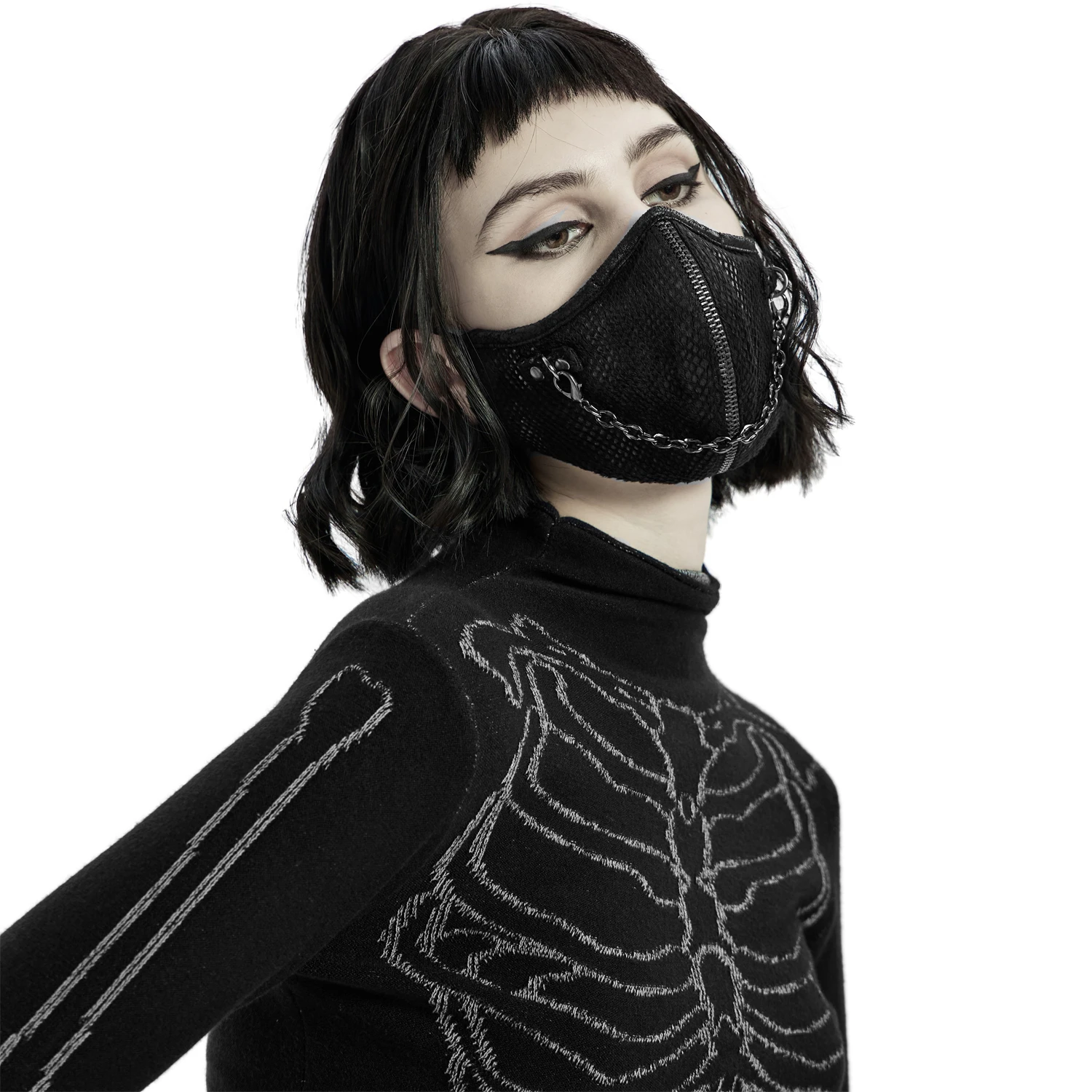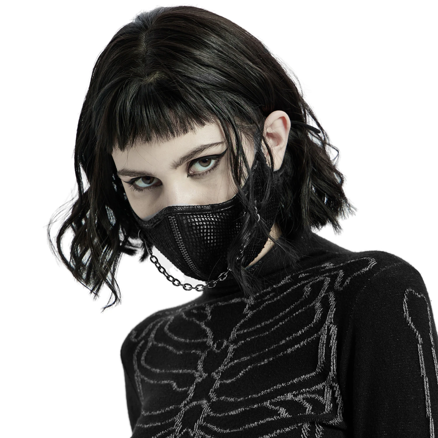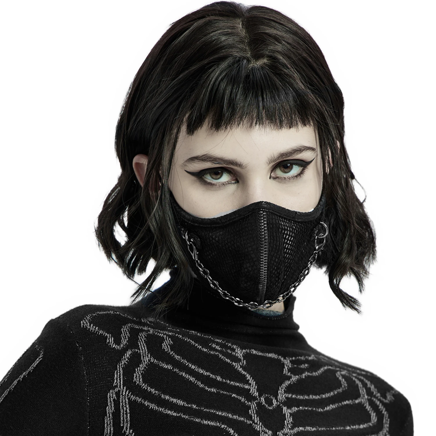 Masque noir avec un fermeture à glissière décorative et une chaine attachée de part et d’autre