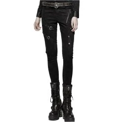 Pantalon pour femme noir, coupe slim, noir délavé à la pierre, orné de lanières de ceinture et de boutons-pression.
