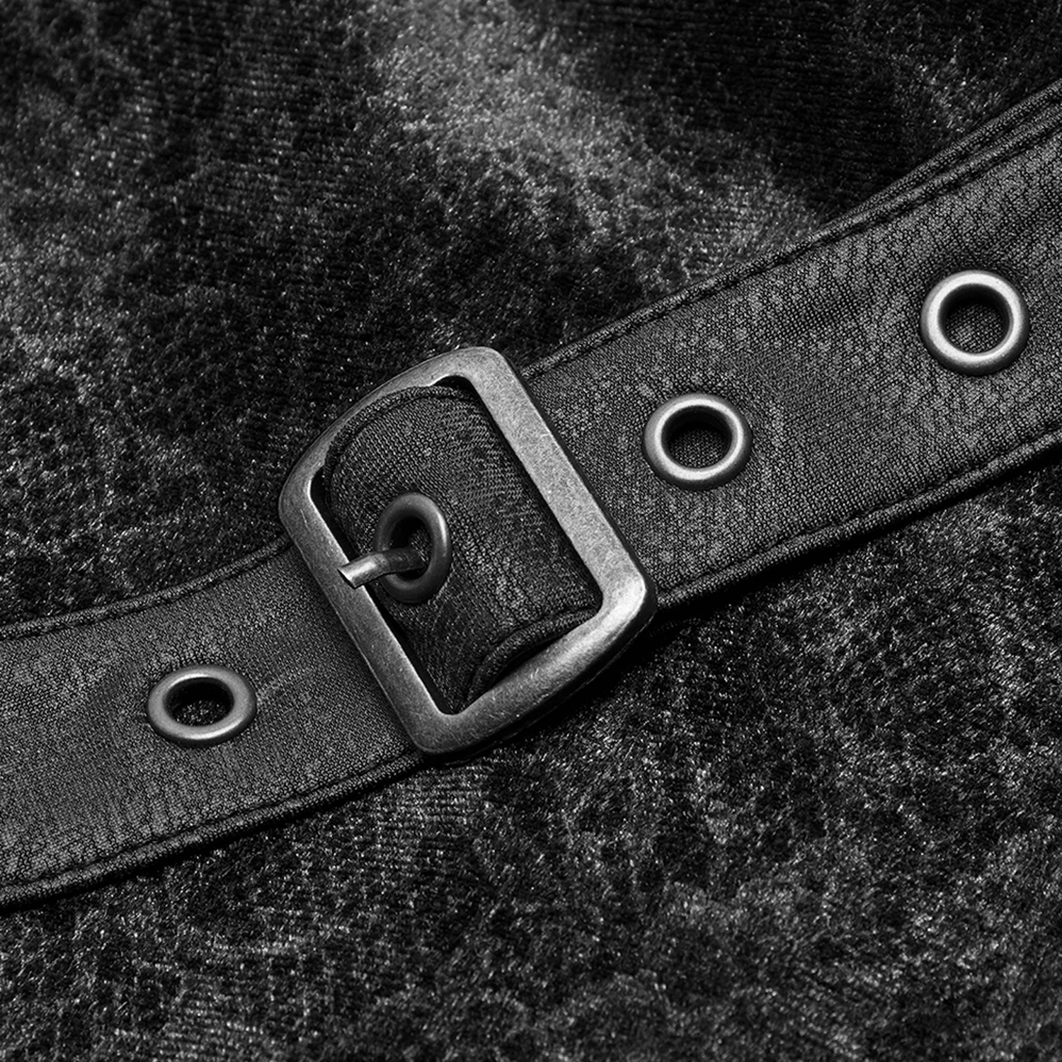 • Ceinture ajustable en similicuir vieilli, dotée d’un empiècement à lacets au niveau de la cuisse droite et d’une sangle à boucle supplémentaire.