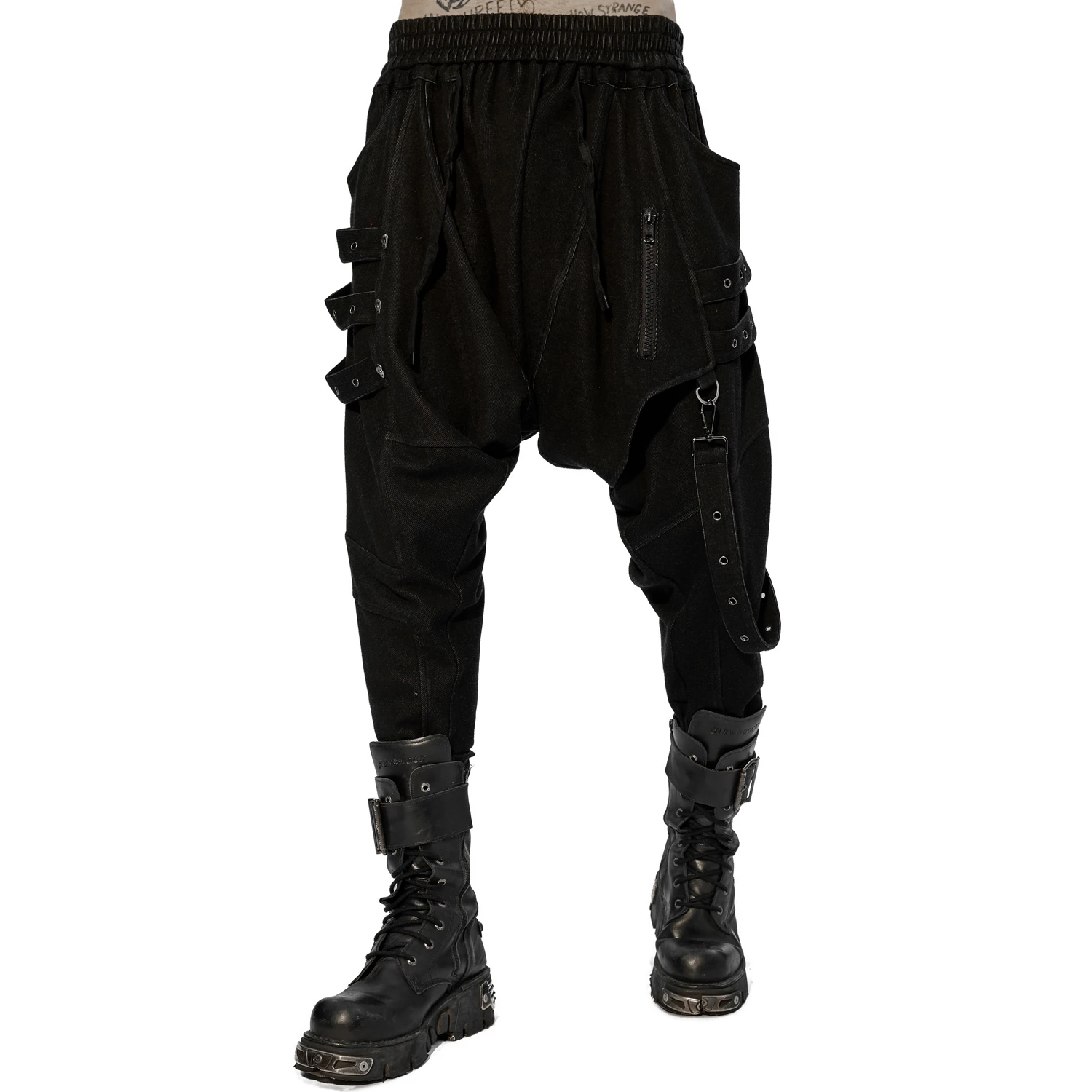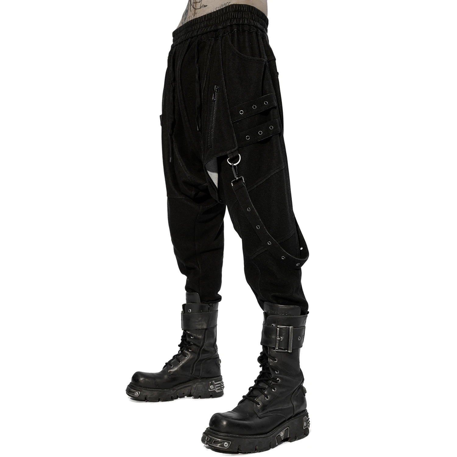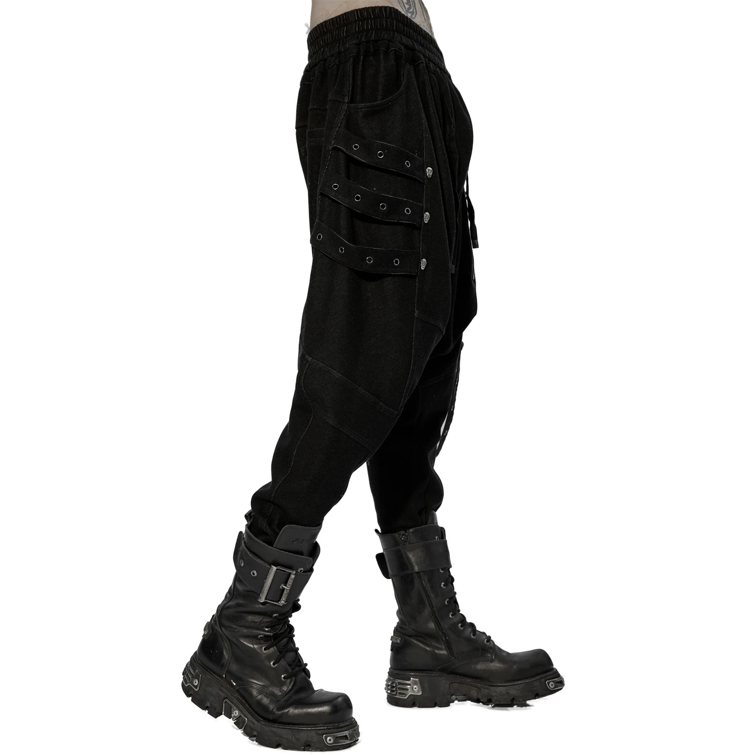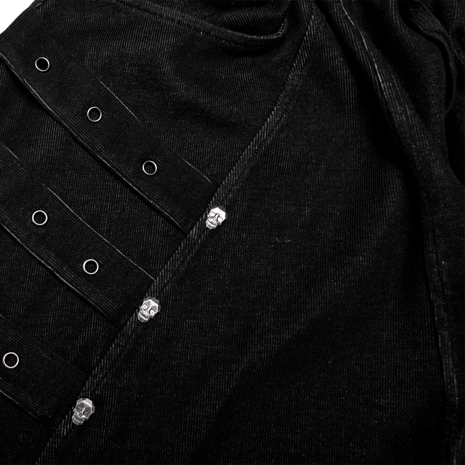 • Sangles décoratives avec œillets, de chaque côté, agrémentées de rivets en forme de skulls sur la jambe droite