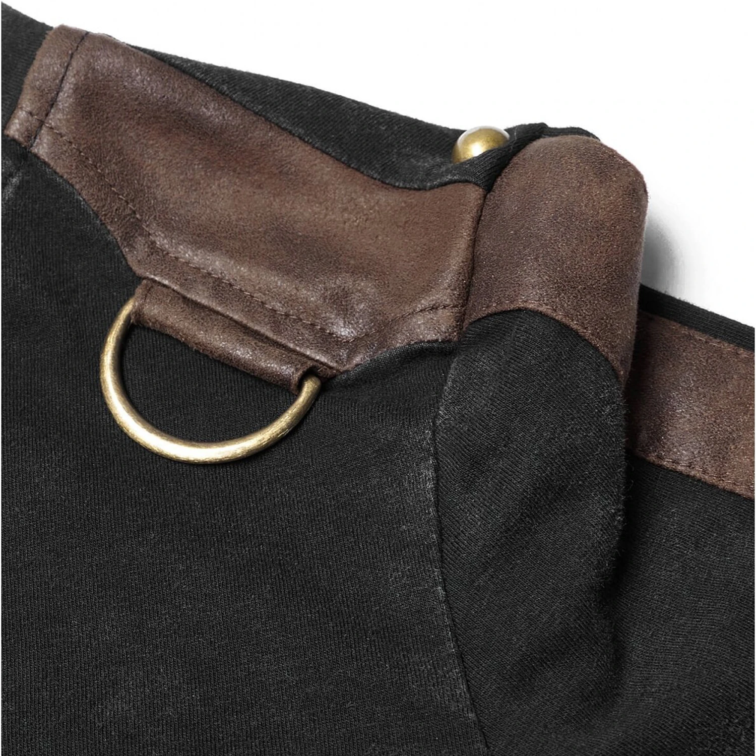 • Garnitures en cuir synthétique marron doux sur les épaules et les manches décorées de clous et d’anneaux en D