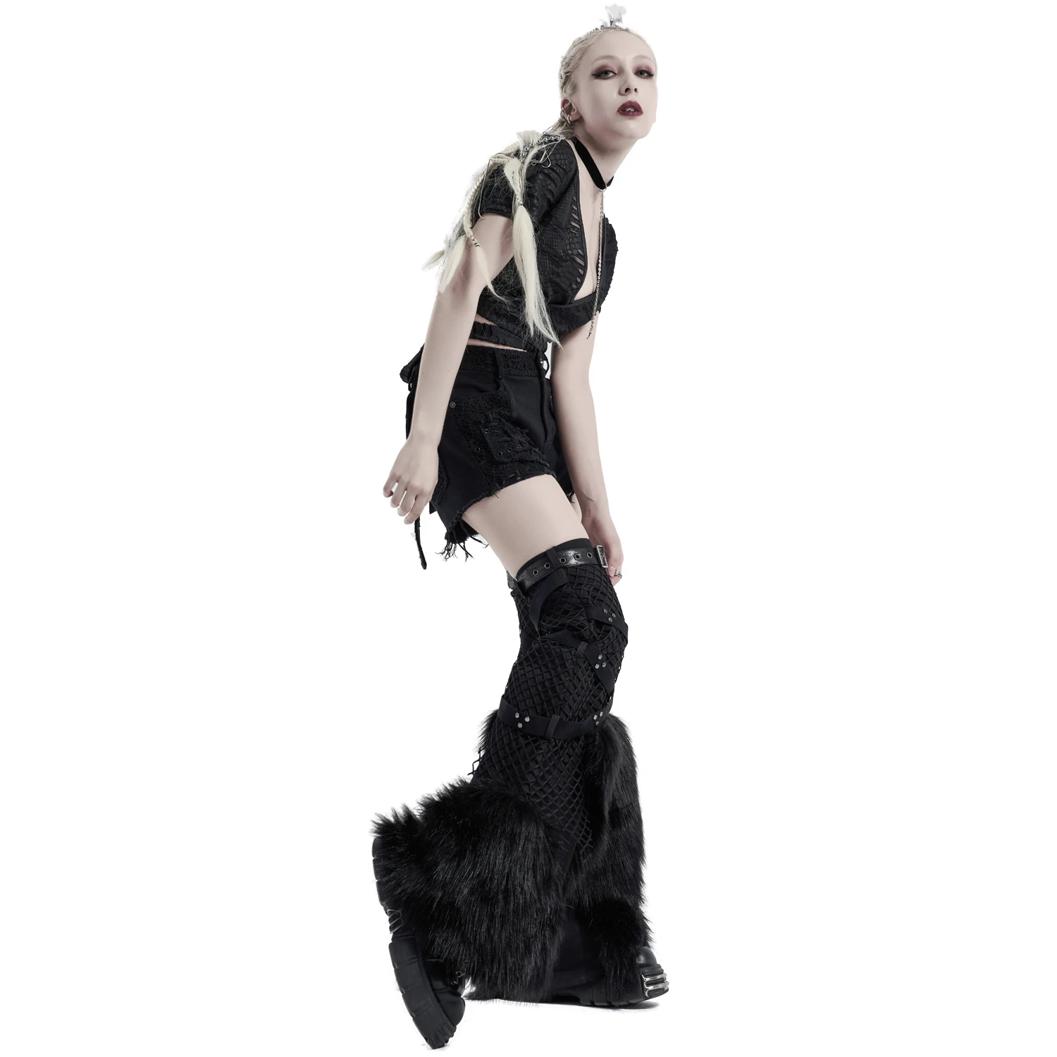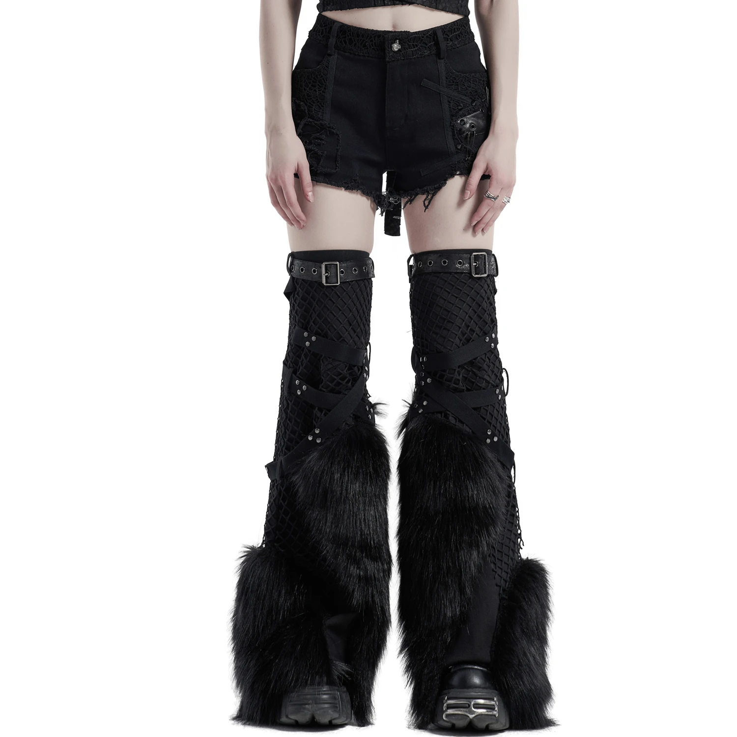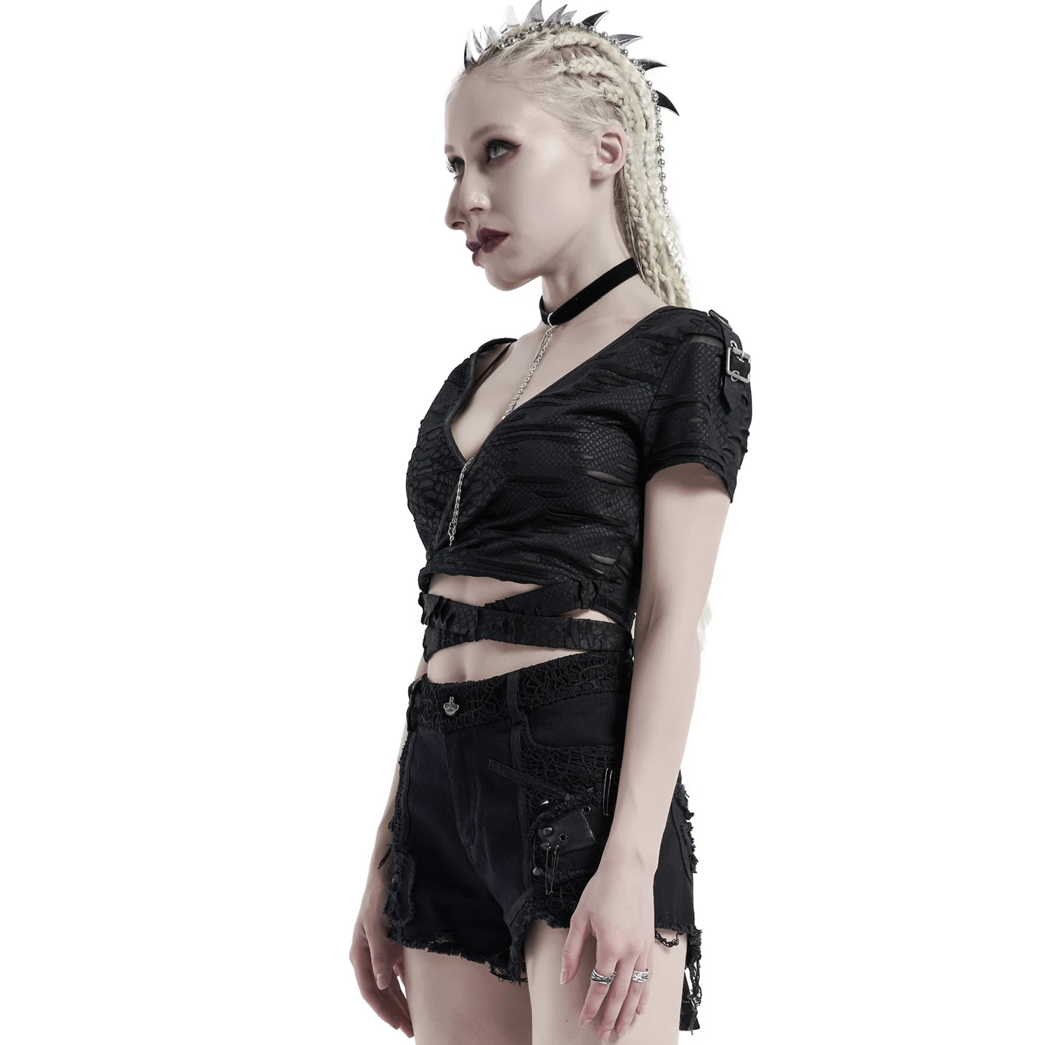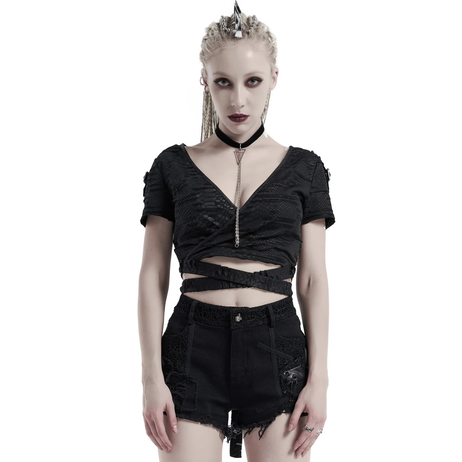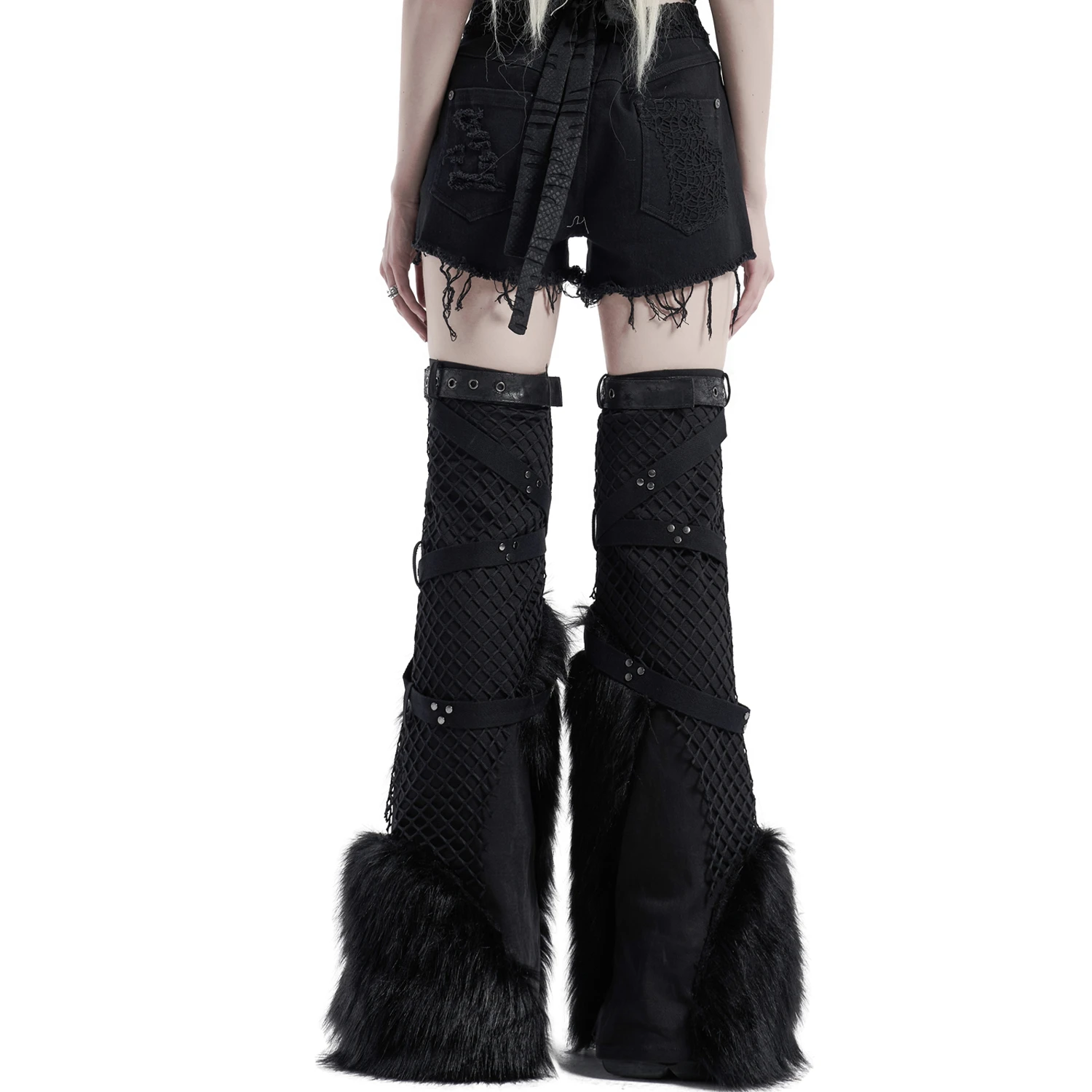 • Dentelle noire de chaque côté, sur la ceinture et sur une poche arrière