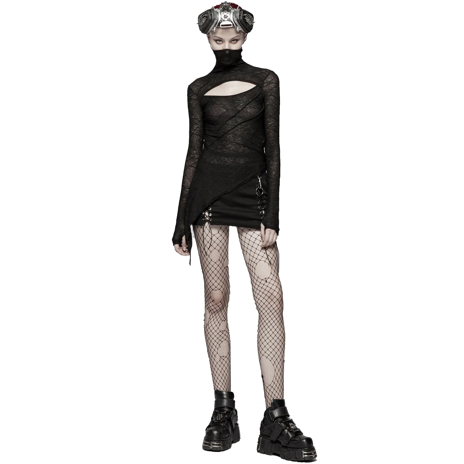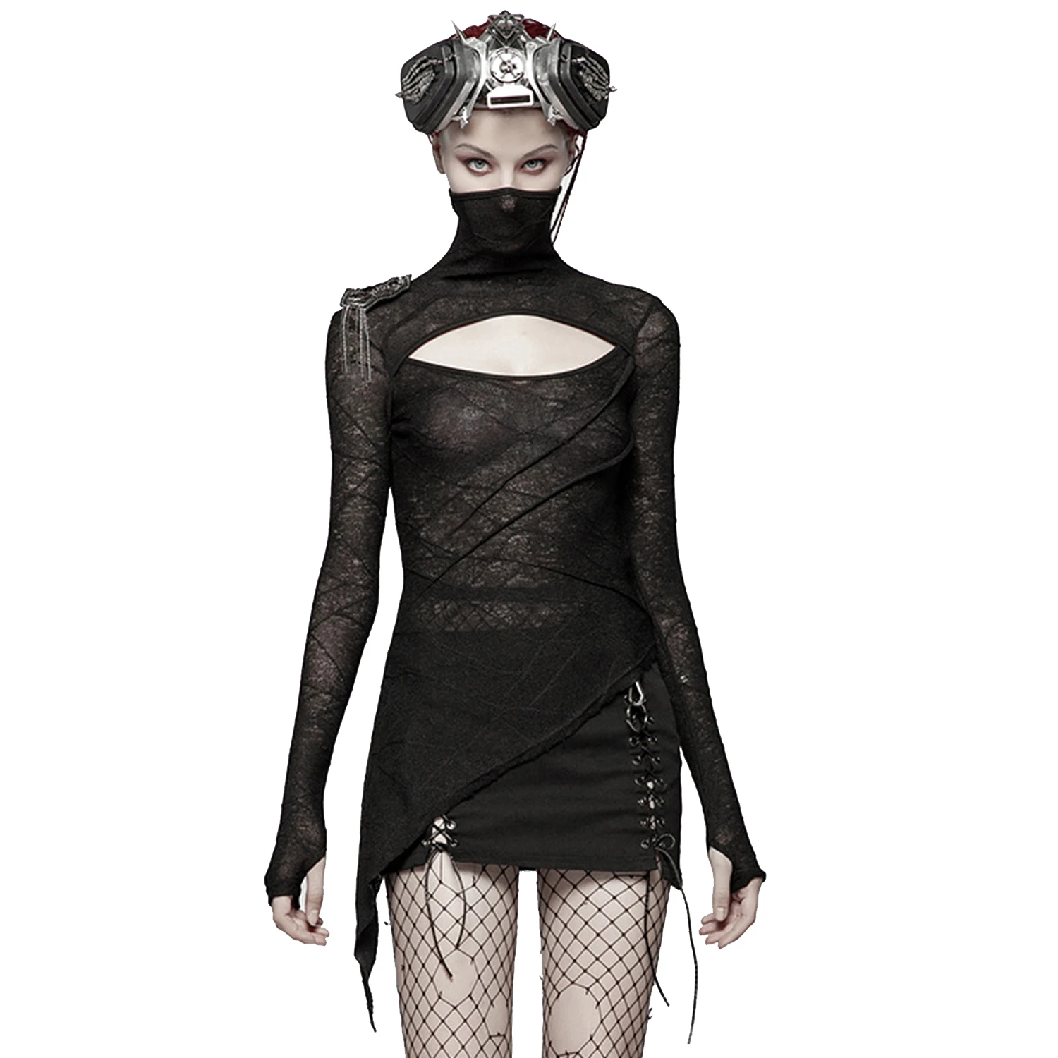 Top noir à manches longues pour femmes, de style gothique, à col haut avec découpes au niveau de la poitrine, asymétrique sur le côté avec broche d’épaule amovible.
