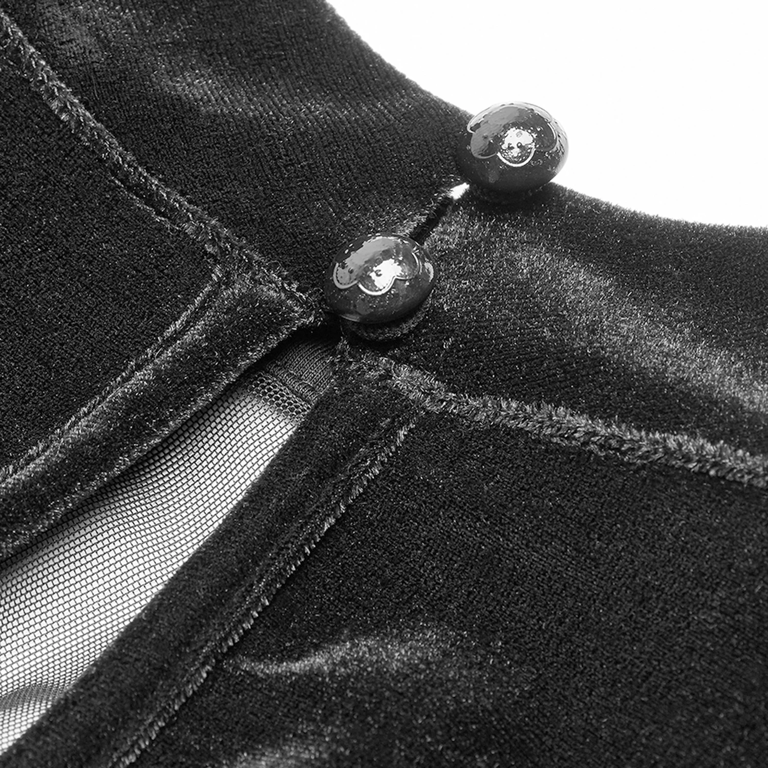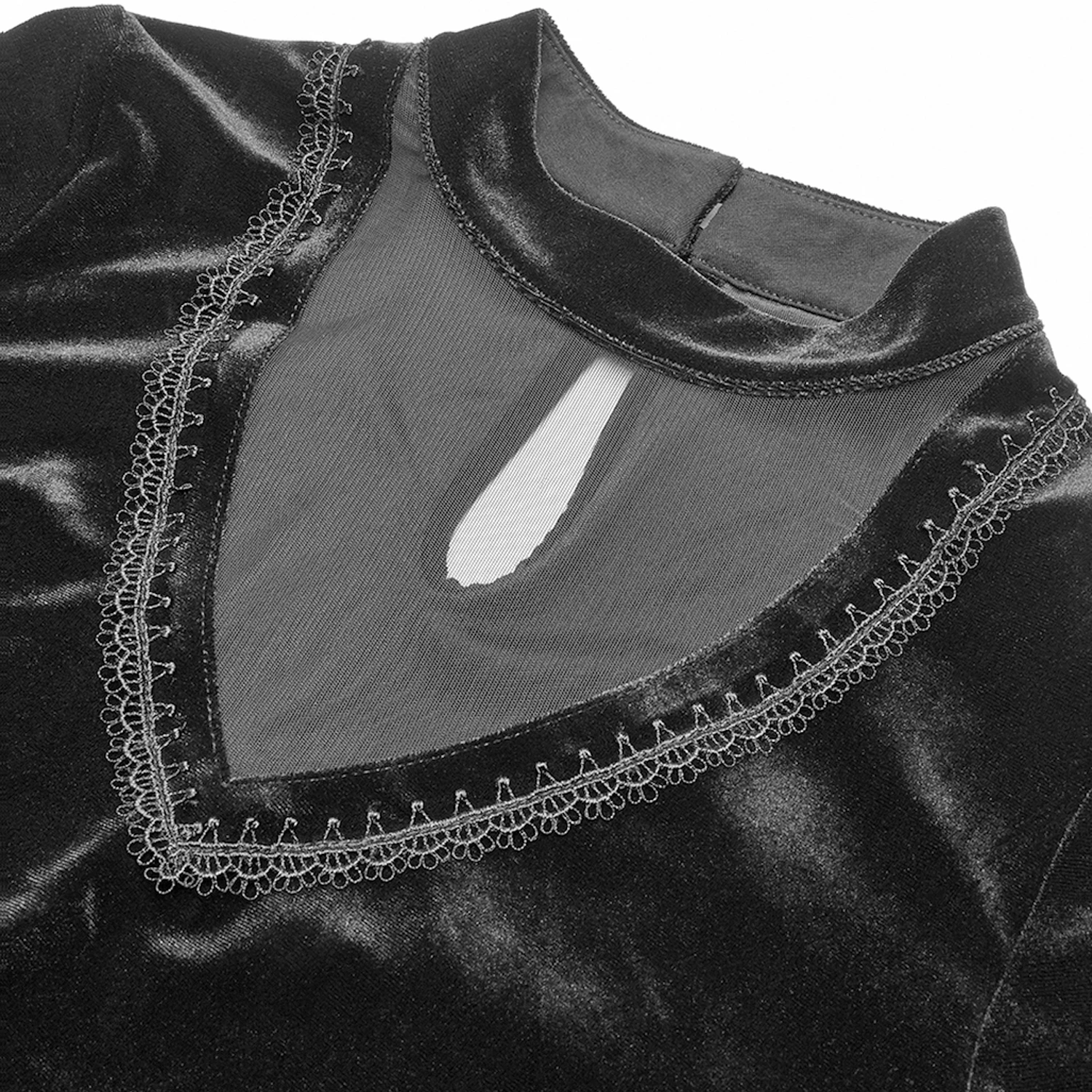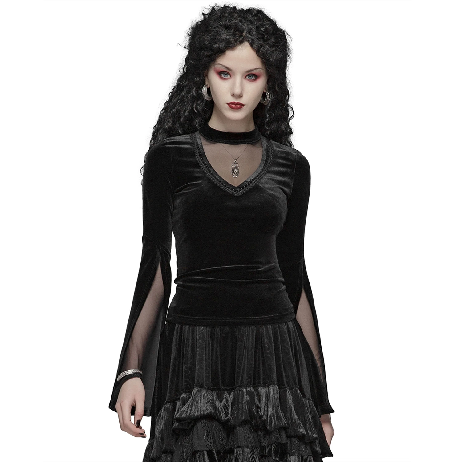 Chemisier en velours noir pour femme de style gothique romantique avec détails transparents sur le décolleté et manches évasées.