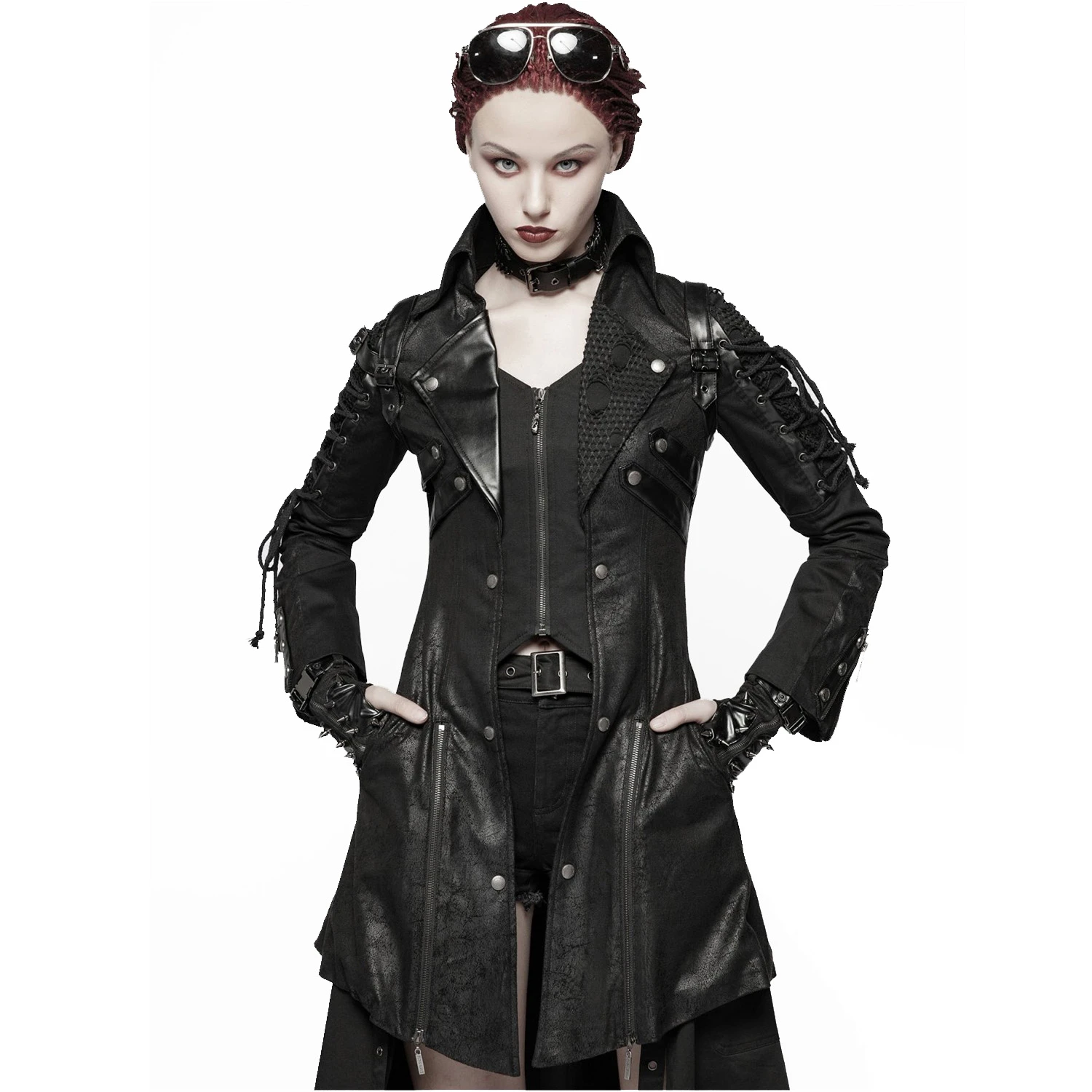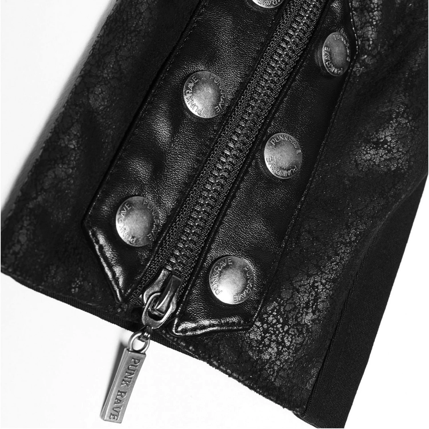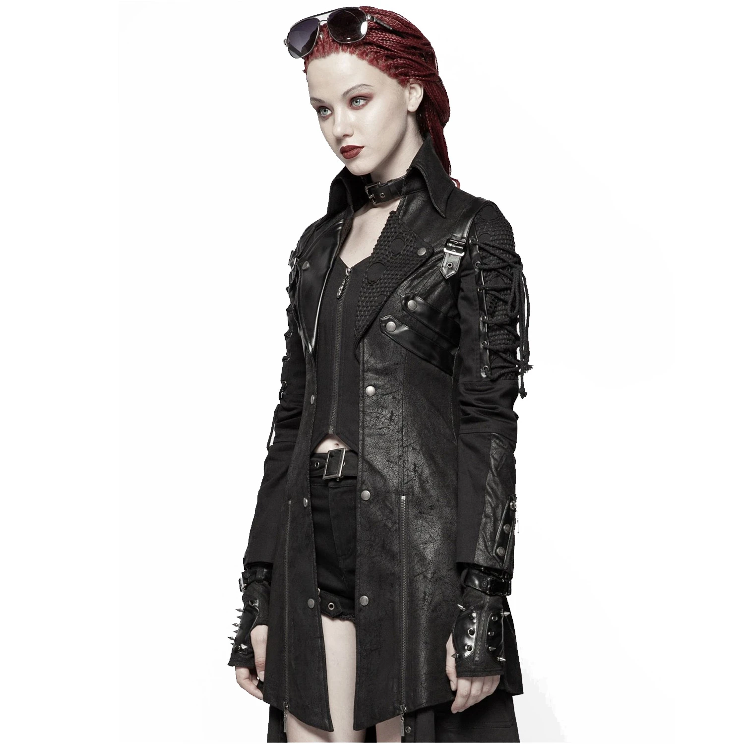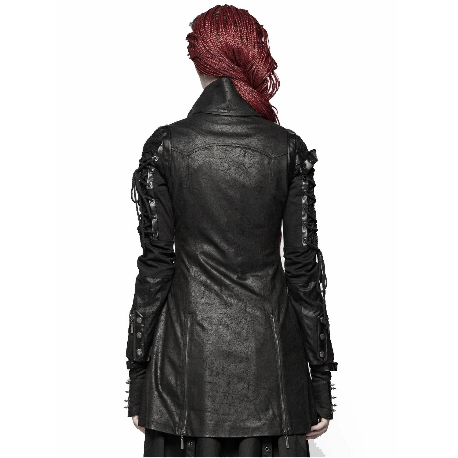 Veste noire gothique pour femme décorée de détails en cuir végétal synthétique, de tissu en résille, de fermetures à glissière et d’œillets à clous.