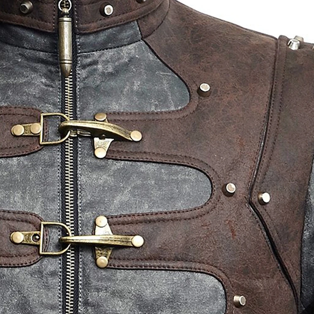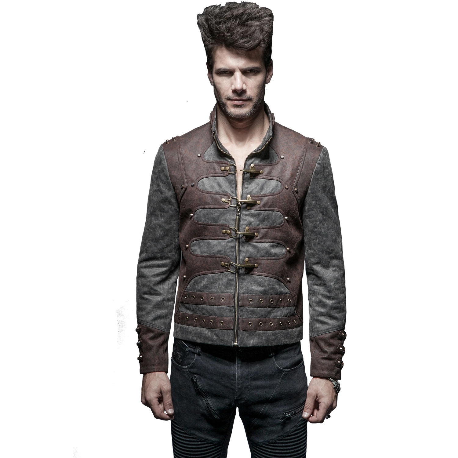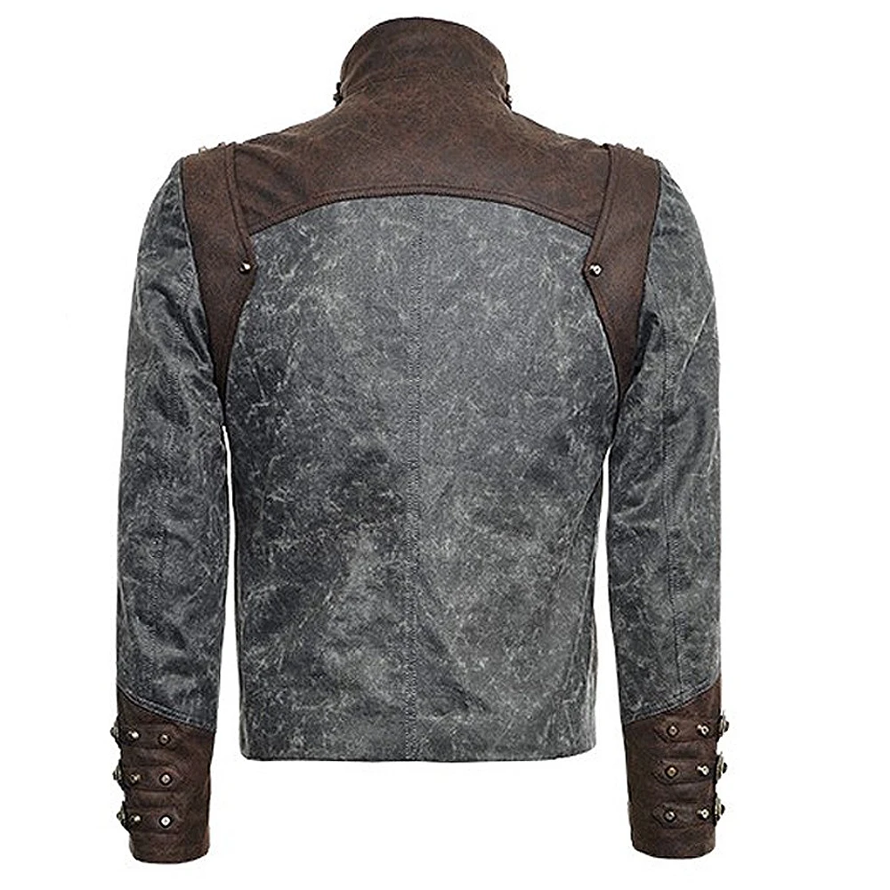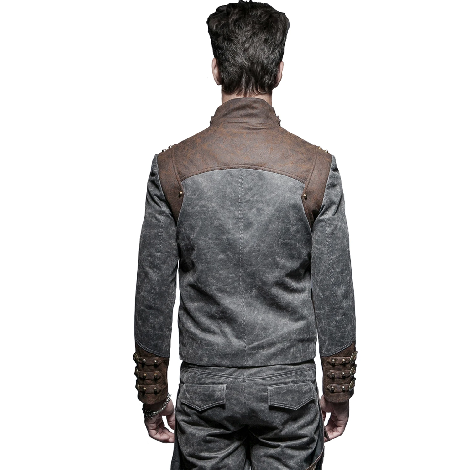 Veste homme de style steampunk noire lavée à la pierre et marron courte décorée avec des clous en bronze et des oeillets.